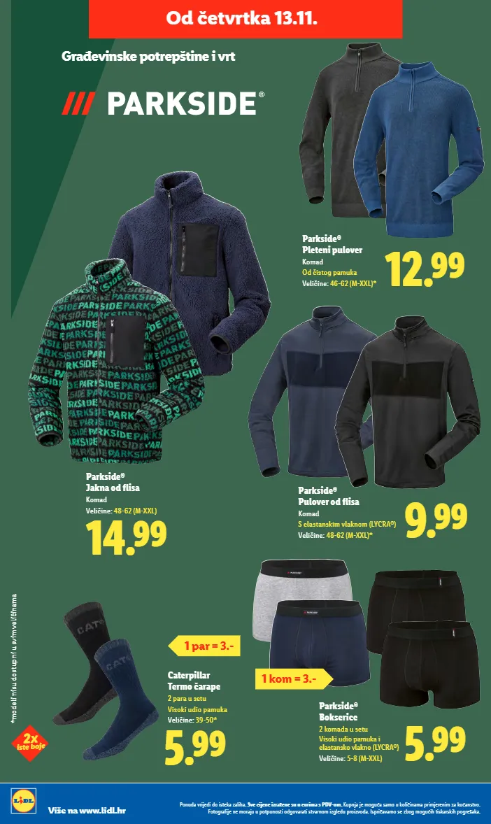 12.99 parkside® pleteni pulover komad od čistog pamuka veličine: 46-62 (m-xxl)* 9.99 parkside® pulover od flisa komad s elastanskim vlaknom (lycra®) veličine: 48-62 (m-xxl)* 5.99 caterpillar termo čarape 2 para u setu visoki udio pamuka veličine: 39-50* od četvrtka 13.11. 1 par = 3.- 2x iste boje 14.99 parkside® jakna od flisa komad veličine: 48-62 (m-xxl) 5.99 parkside® bokserice 2 komada u setu visoki udio pamuka i elastansko vlakno (lycra®) veličine: 5-8 (m-xxl) *modeli nisu dostupni u svim veličinama građevinske potrepštine i vrt 1 kom = 3.- ponuda vrijedi do isteka zaliha. sve cijene izražene su u eurima s pdv-om. kupnja je moguća samo u količinama primjerenim za kućanstvo. fotografije ne moraju u potpunosti odgovarati stvarnom izgledu proizvoda. ispričavamo se zbog mogućih tiskarskih pogrešaka. više na www.lidl.hr