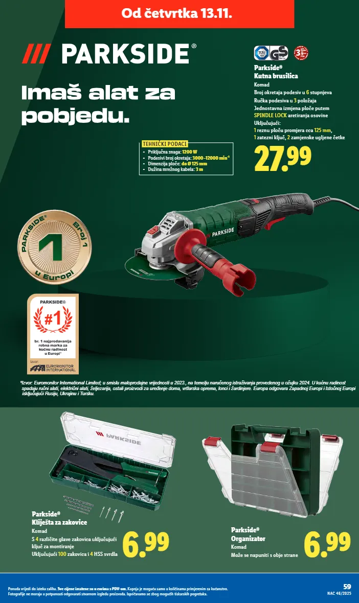 27.99 parkside® kutna brusilica komad broj okretaja podesiv u 6 stupnjeva ručka podesiva u 3 položaja jednostavna izmjena ploče putem spindle lock aretiranja osovine uključujući: 1 reznu ploču promjera cca 125 mm , 1 zatezni ključ, 2 zamjenske ugljene četke 6.99 parkside® kliješta za zakovice komad s 4 različite glave zakovica uključujući ključ za montiranje uključujući 100 zakovica i 4 hss svrdla 6.99 parkside® organizator komad može se napuniti s obje strane tehnički podaci • priključna snaga: 1200 w • podesivi broj okretaja: 3000–12000 min -1 • dimenzija ploče: do ø 125 mm • dužina mrežnog kabela: 3 m *izvor: euromonitor international limited; u smislu maloprodajne vrijednosti u 2023., na temelju naručenog istraživanja provedenog u ožujku 2024. u kućnu radinost spadaju ručni alati, električni alati, željezarija, ostali proizvodi za uređenje doma, vrtlarska oprema, lonci i žardinjere. europa odgovara zapadnoj europi i istočnoj europi isključujući rusiju, ukrajinu i tursku. izvor: # 1 br. 1 najprodavanija robna marka za kućnu radinost u europi* parkside® od četvrtka 13.11. 59 nac 46/2025 ponuda vrijedi do isteka zaliha. sve cijene izražene su u eurima s pdv-om. kupnja je moguća samo u količinama primjerenim za kućanstvo. fotografije ne moraju u potpunosti odgovarati stvarnom izgledu proizvoda. ispričavamo se zbog mogućih tiskarskih pogrešaka.