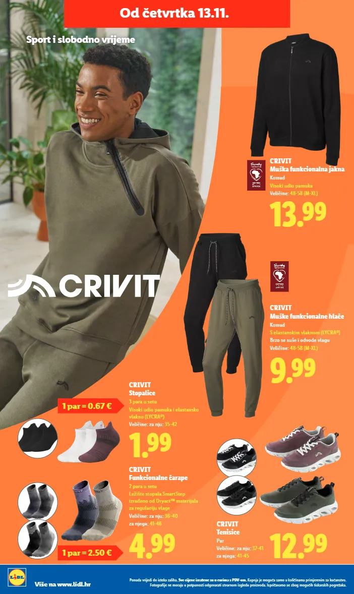 od četvrtka 13.11. crivit stopalice 3 para u setu visoki udio pamuka i elastansko vlakno (lycra®) veličine: za nju: 35-42 1.99 crivit muška funkcionalna jakna komad visoki udio pamuka veličine: 48-58 (m-xl) 13.99 crivit muške funkcionalne hlače komad s elastanskim vlaknom (lycra®) brzo se suše i odvode vlagu veličine: 48-58 (m-xl) 9.99 crivit funkcionalne čarape 2 para u setu ležište stopala smartstep izrađeno od dryact™ materijala za regulaciju vlage veličine: za nju: 36-40 za njega: 41-46 4.99 1 par = 0.67 € crivit tenisice par veličine: za nju: 37-41 za njega: 41-45 12.99 1 par = 2.50 € sport i slobodno vrijeme ponuda vrijedi do isteka zaliha. sve cijene izražene su u eurima s pdv-om. kupnja je moguća samo u količinama primjerenim za kućanstvo. fotografije ne moraju u potpunosti odgovarati stvarnom izgledu proizvoda. ispričavamo se zbog mogućih tiskarskih pogrešaka. više na www.lidl.hr