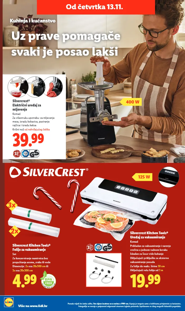 4.99 silvercrest kitchen tools® folije za vakuumiranje set za konzerviranje namirnica bez propuštanja aroma, zraka ili vode dimenzije: 2x cca 28x300 cm ili 3x cca 20x300 cm 2x 3x 125 w uz prave pomagače svaki je posao lakši kuhinja i kućanstvo 400 w ponuda vrijedi do isteka zaliha. sve cijene izražene su u eurima s pdv-om. kupnja je moguća samo u količinama primjerenim za kućanstvo. fotografije ne moraju u potpunosti odgovarati stvarnom izgledu proizvoda. ispričavamo se zbog mogućih tiskarskih pogrešaka. više na www.lidl.hr 19.99 silvercrest kitchen tools® uređaj za vakuumiranje komad prikladan za vakuumiranje i varenje vrećica u jednom radnom koraku idealan za sous-vide kuhanje uključujući priključke za eksterno vakuumiranje posuda za folije do maks. širine 30 cm uključujući rolu folije od 3 m od četvrtka 13.11. 39.99 silvercrest® električni uređaj za mljevenje komad za višestruku upotrebu: za mljevenje mesa, izradu kobasica, pasiranje rajčica i izradu keksa križni nož od nehrđajućeg čelika
