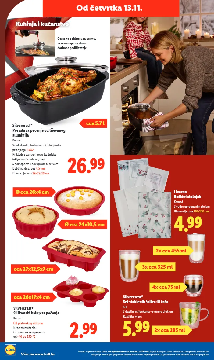 4.99 livarno božićni stolnjak komad s vodonepropusnim slojem dimenzije: cca 110x160 cm kuhinja i kućanstvo ponuda vrijedi do isteka zaliha. sve cijene izražene su u eurima s pdv-om. kupnja je moguća samo u količinama primjerenim za kućanstvo. fotografije ne moraju u potpunosti odgovarati stvarnom izgledu proizvoda. ispričavamo se zbog mogućih tiskarskih pogrešaka. više na www.lidl.hr od četvrtka 13.11. 26.99 silvercrest® posuda za pečenje od lijevanog aluminija komad visokokvalitetni keramički sloj protiv prianjanja ilag® prikladna za sve tipove štednjaka (uključujući indukcijske) s poklopcem i odvojivom rešetkom debljina dna: cca 4.5 mm dimenzije: cca 39x22x16 cm otvor na poklopcu za aromu, za ravnomjerno i fino dozirano podlijevanje 4x cca 75 ml 5.99 silvercrest® set staklenih šalica ili čaša set s duplim stijenkama - s termo efektom različite vrste 3x cca 325 ml 2x cca 455 ml 2x cca 285 ml cca 5.7 l 2.99 silvercrest® silikonski kalup za pečenje komad od platinskog silikona neprianjajući sloj otporan na temperaturu od -40 do 250 °c ø cca 24x10,5 cm cca 27x12,5x7 cm ø cca 26x4 cm cca 26x17x4 cm