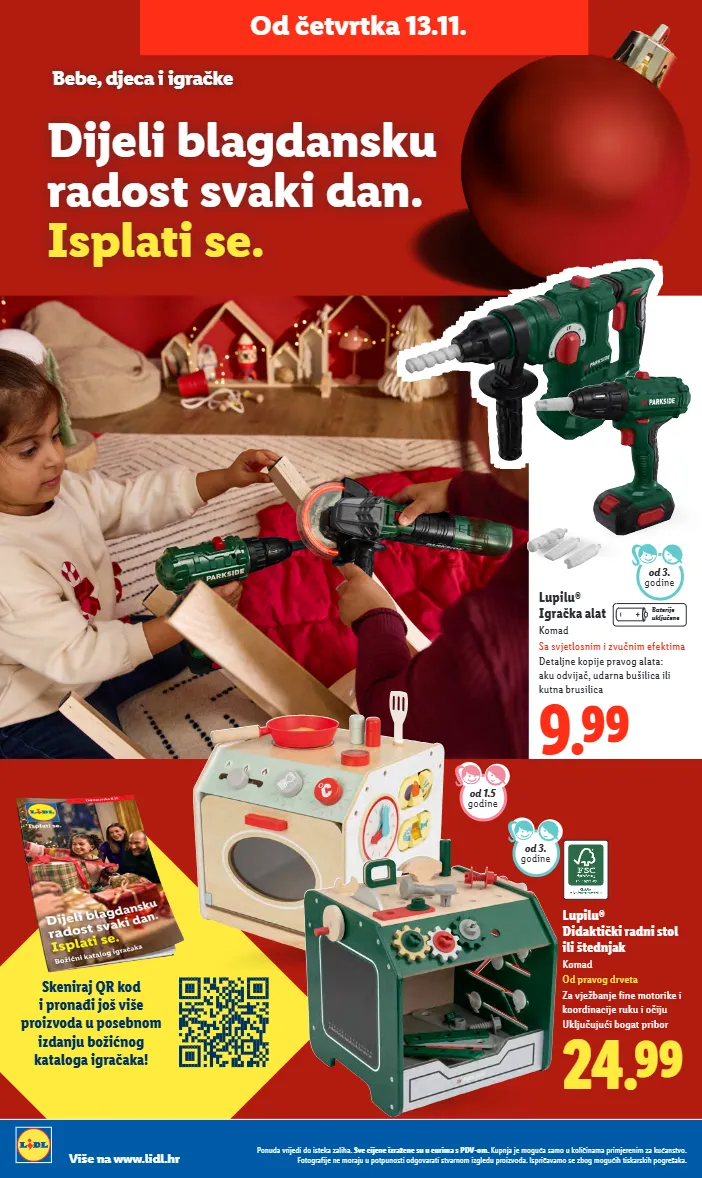 od 1.5 godine od 3. godine od 3. godine baterije uključene dijeli blagdansku radost svaki dan. isplati se. bebe, djeca i igračke skeniraj qr kod i pronađi još više proizvoda u posebnom izdanju božićnog kataloga igračaka! ponuda vrijedi do isteka zaliha. sve cijene izražene su u eurima s pdv-om. kupnja je moguća samo u količinama primjerenim za kućanstvo. fotografije ne moraju u potpunosti odgovarati stvarnom izgledu proizvoda. ispričavamo se zbog mogućih tiskarskih pogrešaka. više na www.lidl.hr 24.99 lupilu® didaktički radni stol ili štednjak komad od pravog drveta za vježbanje fine motorike i koordinacije ruku i očiju uključujući bogat pribor 9.99 lupilu® igračka alat komad sa svjetlosnim i zvučnim efektima detaljne kopije pravog alata: aku odvijač, udarna bušilica ili kutna brusilica od četvrtka 13.11.