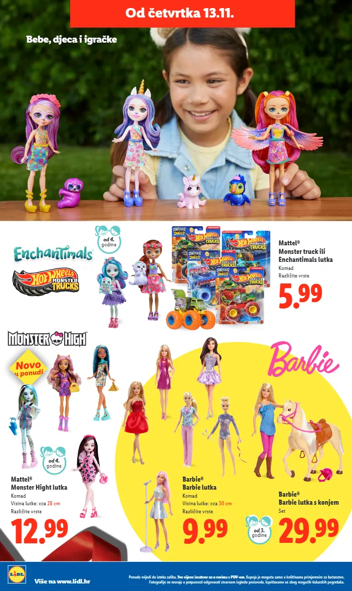 Novo u ponudi Od četvrtka 13.11. od 3. godine od 4. godine od 4. godine Bebe, djeca i igračke Ponuda vrijedi do isteka zaliha. Sve cijene izražene su u eurima s PDV-om. Kupnja je moguća samo u količinama primjerenim za kućanstvo. Fotografije ne moraju u potpunosti odgovarati stvarnom izgledu proizvoda. Ispričavamo se zbog mogućih tiskarskih pogrešaka. Više na www.lidl.hr 12.99 Mattel® Monster Hight lutka Komad Visina lutke: cca 28 cm Različite vrste 5.99 Mattel® Monster truck ili Enchantimals lutka Komad Različite vrste 9.99 Barbie® Barbie lutka Komad Visina lutke: cca 30 cm Različite vrste 29.99 Barbie® Barbie lutka s konjem Set