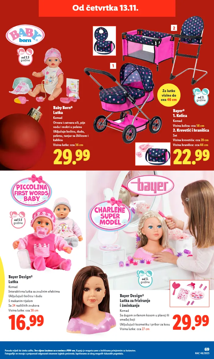 Od četvrtka 13.11. od 3. godine Za lutke visine do cca 46 cm od 1.5 godine od 3. godine od 1.5 godine 1 2 69 NAC 46/2025 Ponuda vrijedi do isteka zaliha. Sve cijene izražene su u eurima s PDV-om. Kupnja je moguća samo u količinama primjerenim za kućanstvo. Fotografije ne moraju u potpunosti odgovarati stvarnom izgledu proizvoda. Ispričavamo se zbog mogućih tiskarskih pogrešaka. 16.99 Bayer Design® Lutka Komad Interaktivna lutka sa zvučnim efektima Uključujući bočicu i dudu S mekanim tijelom Sa 24 različitih zvukova Visina lutke: cca 38 cm 29.99 Bayer Design® Lutka za friziranje i šminkanje Komad Sa dugom svilenom kosom u plavoj ili smeđoj boji Uključujući kozmetiku i pribor za kosu Visina lutke: cca 27 cm 22.99 Bayer® 1. Kolica Komad Visina kolica: cca 56 cm 2. Krevetić i hranilica Set Visina krevetića: cca 28 cm Visina hranilice: cca 66 cm 29.99 Baby Born® Lutka Komad Otvara i zatvara oči, pije vodu i mokri u pelenu Uključuje bočicu, dudu, pelenu, tanjur sa žličicom i kahlicu Visina lutke: cca 36 cm
