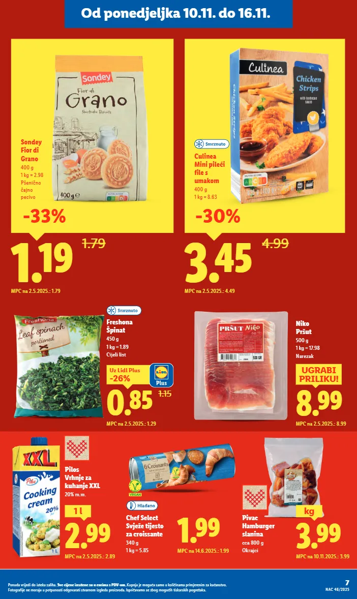 pilos vrhnje za kuhanje xxl 20% m.m. 2.99 1 l mpc na 2.5.2025.: 2.89 8.99 ugrabi priliku! mpc na 2.5.2025.: 8.99 niko pršut 500 g 1 kg = 17.98 narezak freshona špinat 450 g 1 kg = 1.89 cijeli list 1.15 0.85 -26% uz lidl plus mpc na 2.5.2025.: 1.29 3.45 4.99 culinea mini pileći file s umakom 400 g 1 kg = 8.63 mpc na 2.5.2025.: 4.49 -30% 1.19 1.79 sondey fior di grano 400 g 1 kg = 2.98 pšenično čajno pecivo mpc na 2.5.2025.: 1.79 -33% 1.99 mpc na 14.6.2025.: 1.99 chef select svježe tijesto za croissante 340 g 1 kg = 5.85 3.99 kg mpc na 10.11.2025.: 3.99 pivac hamburger slanina cca 800 g okrajci 7 nac 46/2025 ponuda vrijedi do isteka zaliha. sve cijene izražene su u eurima s pdv-om. kupnja je moguća samo u količinama primjerenim za kućanstvo. fotografije ne moraju u potpunosti odgovarati stvarnom izgledu proizvoda. ispričavamo se zbog mogućih tiskarskih pogrešaka. od ponedjeljka 10.11. do 16.11.
