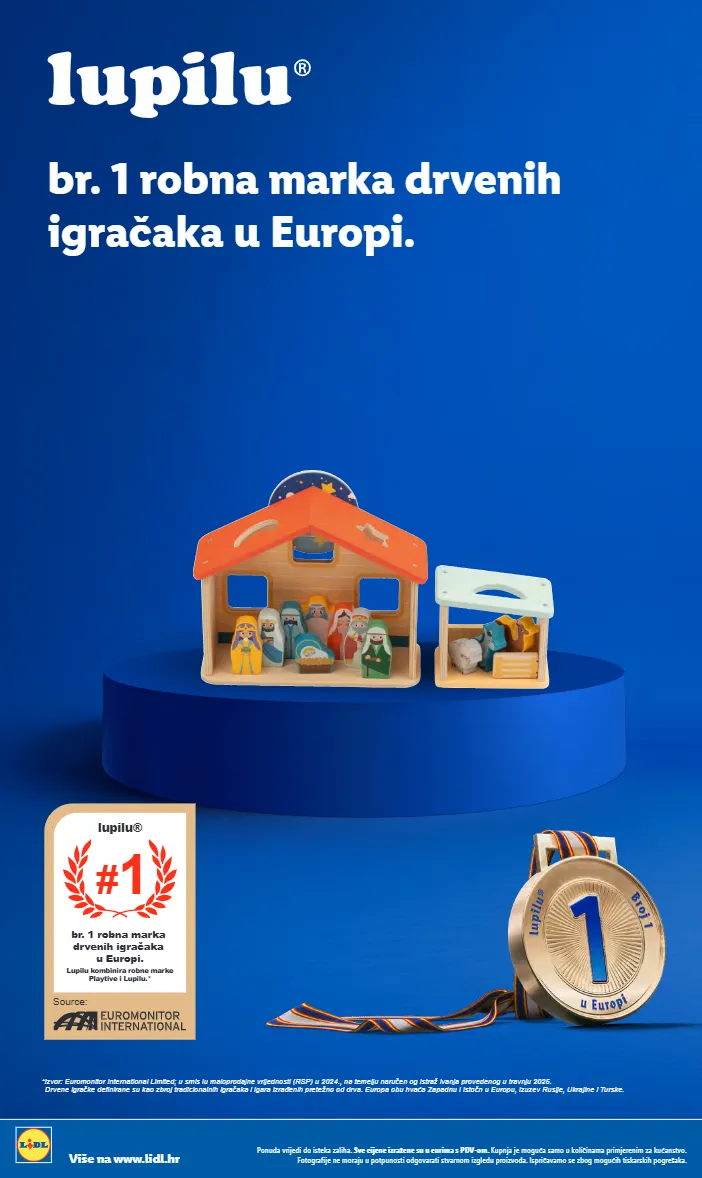 Od četvrtka 13.11. br. 1 robna marka drvenih igračaka u Europi. *Izvor: Euromonitor International Limited; u smis lu maloprodajne vrijednosti (RSP) u 2024., na temelju naručen og istraž ivanja provedenog u travnju 2025. Drvene igračke definirane su kao zbroj tradicionalnih igračaka i igara izrađenih pretežno od drva. Europa obu hvaća Zapadnu i Istočn u Europu, izuzev Rusije, Ukrajine i Turske. Source: # 1 br. 1 robna marka drvenih igračaka u Europi. Lupilu kombinira robne marke Playtive i Lupilu.* lupilu® Ponuda vrijedi do isteka zaliha. Sve cijene izražene su u eurima s PDV-om. Kupnja je moguća samo u količinama primjerenim za kućanstvo. Fotografije ne moraju u potpunosti odgovarati stvarnom izgledu proizvoda. Ispričavamo se zbog mogućih tiskarskih pogrešaka. Više na www.lidl.hr