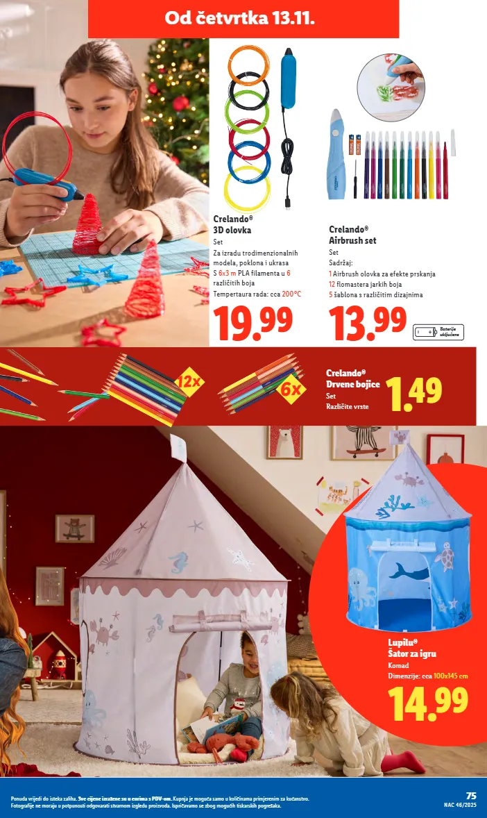 6x 12x 75 nac 46/2025 ponuda vrijedi do isteka zaliha. sve cijene izražene su u eurima s pdv-om. kupnja je moguća samo u količinama primjerenim za kućanstvo. fotografije ne moraju u potpunosti odgovarati stvarnom izgledu proizvoda. ispričavamo se zbog mogućih tiskarskih pogrešaka. 1.49 crelando® drvene bojice set različite vrste 14.99 lupilu® šator za igru komad dimenzije: cca 100x145 cm 13.99 crelando® airbrush set set sadržaj: 1 airbrush olovka za efekte prskanja 12 flomastera jarkih boja 5 šablona s različitim dizajnima 19.99 crelando® 3d olovka set za izradu trodimenzionalnih modela, poklona i ukrasa s 6x3 m pla filamenta u 6 različitih boja tempertaura rada: cca 200°c od četvrtka 13.11. baterije uključene