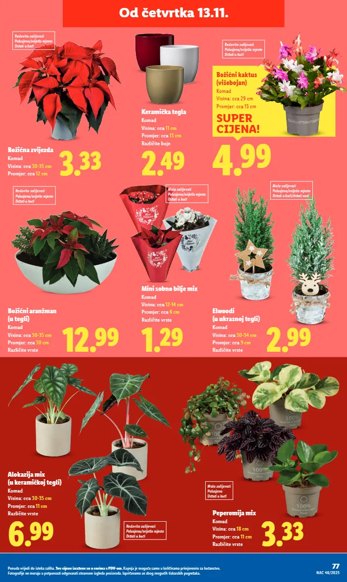 od četvrtka 13.11. ponuda vrijedi do isteka zaliha. sve cijene izražene su u eurima s pdv-om. kupnja je moguća samo u količinama primjerenim za kućanstvo. fotografije ne moraju u potpunosti odgovarati stvarnom izgledu proizvoda. ispričavamo se zbog mogućih tiskarskih pogrešaka. redovito zalijevati polusjena/svijetlo mjesto držati u kući 12.99 božićni aranžman (u tegli) komad visina: cca 30-35 cm promjer: cca 30 cm različite vrste 2.49 keramička tegla komad visina: cca 11 cm promjer: cca 13 cm različite boje 77 nac 46/2025 ponuda vrijedi do isteka zaliha. sve cijene izražene su u eurima s pdv-om. kupnja je moguća samo u količinama primjerenim za kućanstvo. fotografije ne moraju u potpunosti odgovarati stvarnom izgledu proizvoda. ispričavamo se zbog mogućih tiskarskih pogrešaka. 3.33 božićna zvijezda komad visina: cca 30-35 cm promjer: cca 12 cm 1.29 mini sobno bilje mix komad visina: cca 12-14 cm promjer: cca 6 cm različite vrste 3.33 peperomija mix komad visina: cca 18 cm promjer: cca 11 cm različite vrste 4.99 super cijena! božićni kaktus (višebojan) komad visina: cca 29 cm promjer: cca 13 cm redovito zalijevati polusjena/svijetlo mjesto držati u kući redovito zalijevati polusjena/svijetlo mjesto držati u kući malo zalijevati polusjena/svijetlo mjesto držati u kući malo zalijevati polusjena/svijetlo mjesto držati u kući/držati vani 2.99 elwoodi (u ukrasnoj tegli) komad visina: cca 30-34 cm promjer: cca 9 cm različite vrste 6.99 alokazija mix (u keramičkoj tegli) komad visina: cca 30-35 cm promjer: cca 11 cm različite vrste redovito zalijevati polusjena/svijetlo mjesto držati u kući malo zalijevati polusjena držati u kući
