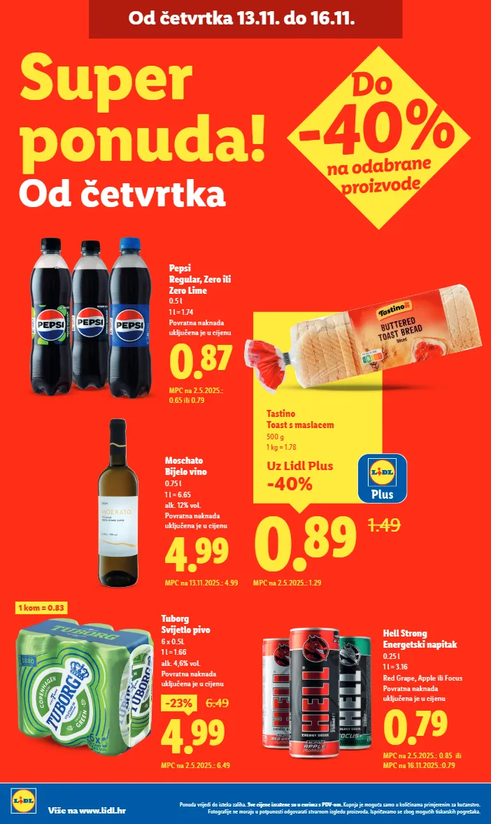 do -xx% na odabrane proizvode super ponuda! od četvrtka do -40% na odabrane proizvode hell strong energetski napitak 0.25 l 1 l = 3.16 red grape, apple ili focus povratna naknada uključena je u cijenu pepsi regular, zero ili zero lime 0.5 l 1 l = 1.74 povratna naknada uključena je u cijenu 0.79 mpc na 2.5.2025.: 0.85 ili mpc na 16.11.2025.:0.79 4.99 mpc na 13.11.2025.: 4.99 0.87 mpc na 2.5.2025.: 0.65 ili 0.79 moschato bijelo vino 0.75 l 1 l = 6.65 alk. 12% vol. povratna naknada uključena je u cijenu 4.99 -23% 6.49 mpc na 2.5.2025.: 6.49 tuborg svijetlo pivo 6 x 0.5l 1 l = 1.66 alk. 4,6% vol. povratna naknada uključena je u cijenu 1 kom = 0.83 uz lidl plus -40% 0.89 1.49 tastino toast s maslacem 500 g 1 kg = 1.78 mpc na 2.5.2025.: 1.29 ponuda vrijedi do isteka zaliha. sve cijene izražene su u eurima s pdv-om. kupnja je moguća samo u količinama primjerenim za kućanstvo. fotografije ne moraju u potpunosti odgovarati stvarnom izgledu proizvoda. ispričavamo se zbog mogućih tiskarskih pogrešaka. više na www.lidl.hr od četvrtka 13.11. do 16.11.