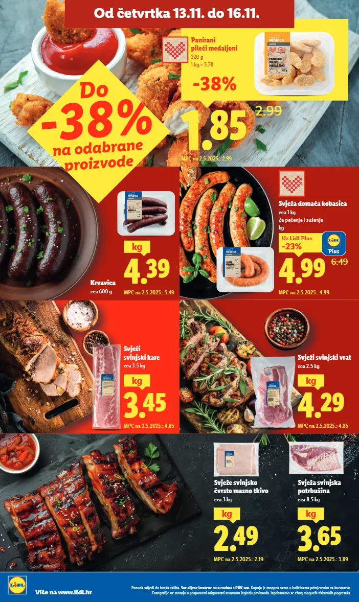 1.85 2.99 panirani pileći medaljoni 320 g 1 kg = 5.78 mpc na 2.5.2025.: 2.99 -38% svježe svinjsko čvrsto masno tkivo cca 3 kg svježa svinjska potrbušina cca 8.5 kg svježi svinjski vrat cca 2.5 kg svježi svinjski kare cca 3.5 kg krvavica cca 600 g svježa domaća kobasica cca 1 kg za pečenje i sušenje kg 6.49 4.99 -23% uz lidl plus mpc na 2.5.2025.: 4.99 do -38% na odabrane proizvode 4.39 kg mpc na 2.5.2025.: 5.49 3.45 kg mpc na 2.5.2025.: 4.65 4.29 kg mpc na 2.5.2025.: 4.85 3.65 kg mpc na 2.5.2025.: 3.89 2.49 kg mpc na 2.5.2025.: 2.19 od četvrtka 13.11. do 16.11. ponuda vrijedi do isteka zaliha. sve cijene izražene su u eurima s pdv-om. kupnja je moguća samo u količinama primjerenim za kućanstvo. fotografije ne moraju u potpunosti odgovarati stvarnom izgledu proizvoda. ispričavamo se zbog mogućih tiskarskih pogrešaka. više na www.lidl.hr