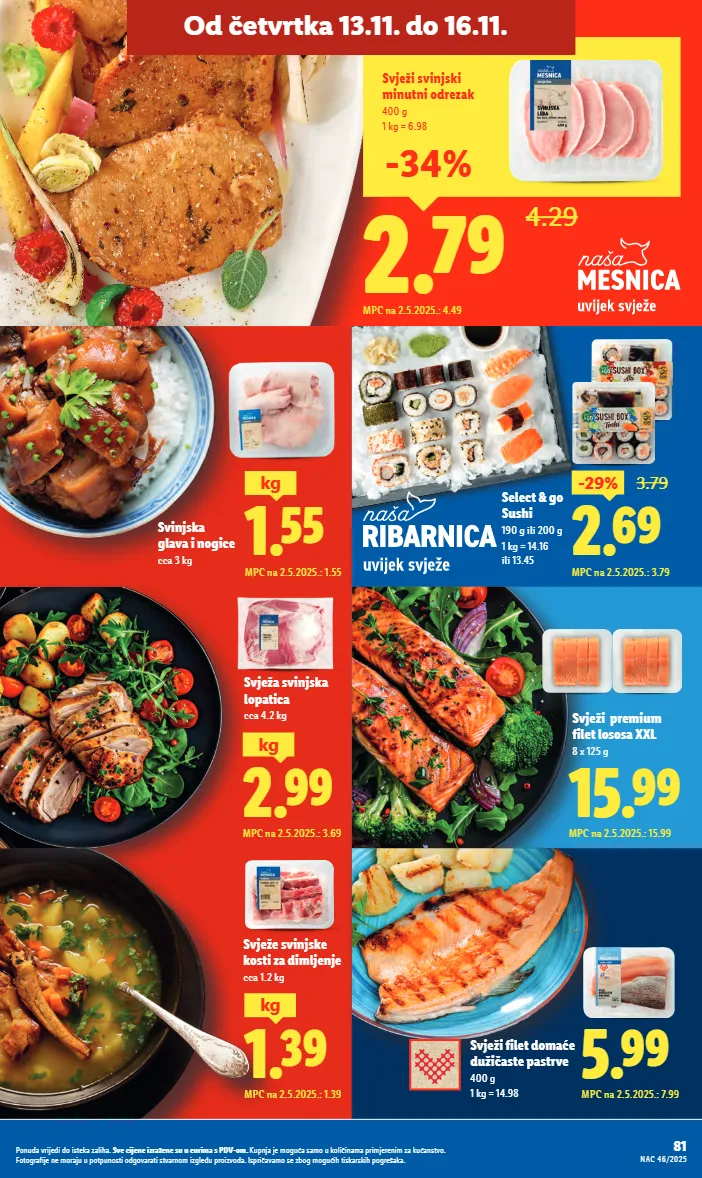 2.79 4.29 svježi svinjski minutni odrezak 400 g 1 kg = 6.98 mpc na 2.5.2025.: 4.49 -34% svježi premium filet lososa xxl 8 x 125 g svježe svinjske kosti za dimljenje cca 1.2 kg select & go sushi 190 g ili 200 g 1 kg = 14.16 ili 13.45 15.99 mpc na 2.5.2025.: 15.99 svježa svinjska lopatica cca 4.2 kg svježi filet domaće dužičaste pastrve 400 g 1 kg = 14.98 5.99 mpc na 2.5.2025.: 7.99 2.99 kg mpc na 2.5.2025.: 3.69 1.39 kg mpc na 2.5.2025.: 1.39 1.55 kg mpc na 2.5.2025.: 1.55 svinjska glava i nogice cca 3 kg 2.69 -29% 3.79 mpc na 2.5.2025.: 3.79 81 nac 46/2025 ponuda vrijedi do isteka zaliha. sve cijene izražene su u eurima s pdv-om. kupnja je moguća samo u količinama primjerenim za kućanstvo. fotografije ne moraju u potpunosti odgovarati stvarnom izgledu proizvoda. ispričavamo se zbog mogućih tiskarskih pogrešaka. od četvrtka 13.11. do 16.11.