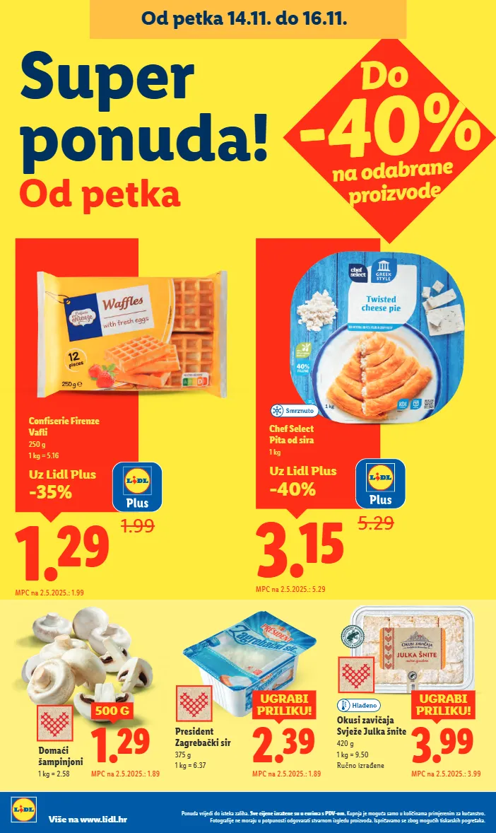 super ponuda! od petka uz lidl plus -40% 3.15 5.29 chef select pita od sira 1 kg mpc na 2.5.2025.: 5.29 3.99 ugrabi priliku! mpc na 2.5.2025.: 3.99 uz lidl plus -35% 1.29 1.99 confiserie firenze vafli 250 g 1 kg = 5.16 mpc na 2.5.2025.: 1.99 2.39 ugrabi priliku! mpc na 2.5.2025.: 1.89 president zagrebački sir 375 g 1 kg = 6.37 okusi zavičaja svježe julka šnite 420 g 1 kg = 9.50 ručno izrađene 1.29 500 g mpc na 2.5.2025.: 1.89 domaći šampinjoni 1 kg = 2.58 do -40% na odabrane proizvode ponuda vrijedi do isteka zaliha. sve cijene izražene su u eurima s pdv-om. kupnja je moguća samo u količinama primjerenim za kućanstvo. fotografije ne moraju u potpunosti odgovarati stvarnom izgledu proizvoda. ispričavamo se zbog mogućih tiskarskih pogrešaka. više na www.lidl.hr od petka 14.11. do 16.11.