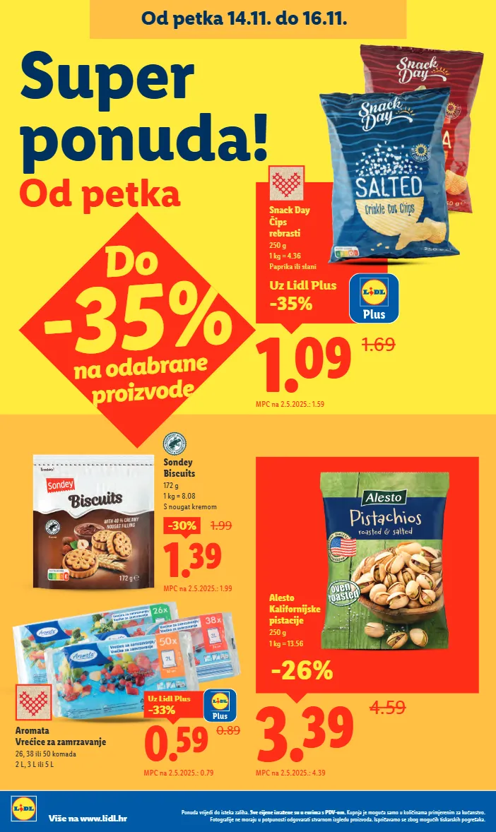 super ponuda! od petka do -35% na odabrane proizvode 1.39 -30% 1.99 mpc na 2.5.2025.: 1.99 sondey biscuits 172 g 1 kg = 8.08 s nougat kremom uz lidl plus -35% 1.09 1.69 snack day čips rebrasti 250 g 1 kg = 4.36 paprika ili slani mpc na 2.5.2025.: 1.59 3.39 4.59 alesto kalifornijske pistacije 250 g 1 kg = 13.56 mpc na 2.5.2025.: 4.39 -26% 0.89 0.59 -33% uz lidl plus mpc na 2.5.2025.: 0.79 aromata vrećice za zamrzavanje 26, 38 ili 50 komada 2 l, 3 l ili 5 l ponuda vrijedi do isteka zaliha. sve cijene izražene su u eurima s pdv-om. kupnja je moguća samo u količinama primjerenim za kućanstvo. fotografije ne moraju u potpunosti odgovarati stvarnom izgledu proizvoda. ispričavamo se zbog mogućih tiskarskih pogrešaka. više na www.lidl.hr od petka 14.11. do 16.11.