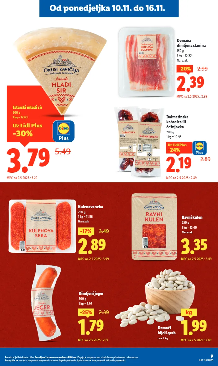2.89 2.19 -24% uz lidl plus mpc na 2.5.2025.: 2.89 dalmatinska kobasica ili češnjovka 200 g 1 kg = 10.95 dimljeni jeger 300 g 1 kg = 5.97 1.79 -25% 2.39 mpc na 2.5.2025.: 2.19 3.35 mpc na 2.5.2025.: 3.49 ravni kulen 250 g 1 kg = 13.40 narezak 2.39 -20% 2.99 mpc na 2.5.2025.: 2.99 domaća dimljena slanina 150 g 1 kg = 15.93 narezak uz lidl plus -30% 3.79 5.49 istarski mladi sir 300 g 1 kg = 12.63 mpc na 2.5.2025.: 5.29 domaći bijeli grah cca 1 kg 2.89 -17% 3.49 mpc na 2.5.2025.: 3.99 kulenova seka 250 g 1 kg = 11.56 narezak 1.99 kg mpc na 2.5.2025.: 2.49 od ponedjeljka 10.11. do 16.11. 9 nac 46/2025 ponuda vrijedi do isteka zaliha. sve cijene izražene su u eurima s pdv-om. kupnja je moguća samo u količinama primjerenim za kućanstvo. fotografije ne moraju u potpunosti odgovarati stvarnom izgledu proizvoda. ispričavamo se zbog mogućih tiskarskih pogrešaka.