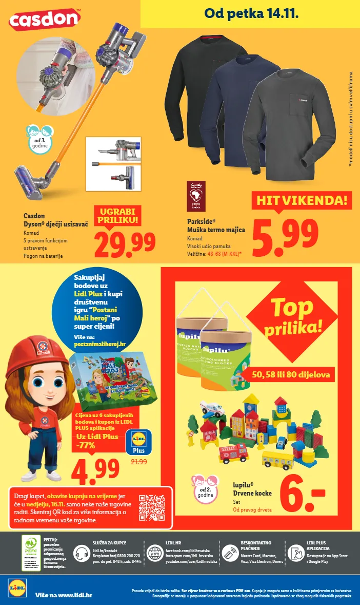 lidl plus aplikacija dostupna je na app store i google play lidl.hr facebook.com/lidlhrvatska instagram.com/lidl_hrvatska youtube.com/user/lidlhrvatska beskontaktno plaćanje master card, maestro, visa, visa electron, diners služba za kupce lidl.hr/kontakt besplatan broj 0800 200 220 pon. do pet. 8-18 h, sub. 8-14 h pefc/56-31-06 pefc certificirano lidl letak iz šuma kojima se održivo gospodari, recikliranih i kontroliranih izvora pefc® je posvećen promicanju odgovornog gospodarenja šumama širom svijeta. od petka 31.10. lidl plus aplikacija dostupna je na app store i google play lidl.hr facebook.com/lidlhrvatska instagram.com/lidl_hrvatska youtube.com/user/lidlhrvatska beskontaktno plaćanje master card, maestro, visa, visa electron, diners služba za kupce lidl.hr/kontakt besplatan broj 0800 200 220 pon. do pet. 8-18 h, sub. 8-14 h pefc/56-31-06 pefc certificirano lidl letak iz šuma kojima se održivo gospodari, recikliranih i kontroliranih izvora pefc® je posvećen promicanju odgovornog gospodarenja šumama širom svijeta. od petka 14.11. parkside® muška termo majica komad visoki udio pamuka veličine: 48-68 (m-xxl)* 5.99 hit vikenda! lidl plus aplikacija dostupna je na app store i google play lidl.hr facebook.com/lidlhrvatska instagram.com/lidl_hrvatska youtube.com/user/lidlhrvatska beskontaktno plaćanje master card, maestro, visa, visa electron, diners služba za kupce lidl.hr/kontakt besplatan broj 0800 200 220 pon. do pet. 8-18 h, sub. 8-14 h pefc/56-31-06 pefc certificirano lidl letak iz šuma kojima se održivo gospodari, recikliranih i kontroliranih izvora pefc® je posvećen promicanju odgovornog gospodarenja šumama širom svijeta. 29.99 u grabi priliku! casdon dyson® dječji usisavač komad s pravom funkcijom usisavanja pogon na baterije od 3. godine 21.99 sakupljaj bodove uz lidl plus i kupi društvenu igru “ postani mali heroj ” po super cijeni! više na: postanimaliheroj.hr 4. 99 -77% uz lidl plus cijena uz 6 sakupljenih bodova i kupon iz lidl plus aplikacije top prilika ! dragi kupci, obavite kupnju na vrijeme jer će u nedjelju, 16.11. samo neke naše trgovine raditi. skeniraj qr kod za više informacija o radnom vremenu vaše trgovine. ponuda vrijedi do isteka zaliha. sve cijene izražene su u eurima s pdv-om. kupnja je moguća samo u količinama primjerenim za kućanstvo. fotografije ne moraju u potpunosti odgovarati stvarnom izgledu proizvoda. ispričavamo se zbog mogućih tiskarskih pogrešaka. više na www.lidl.hr *modeli nisu dostupni u svim veličinama 50, 58 ili 80 dijelova od 2. godine 6.- lupilu® drvene kocke set od pravog drveta ponuda vrijedi do isteka zaliha. sve cijene izražene su u eurima s pdv-om. kupnja je moguća samo u količinama primjerenim za kućanstvo. fotografije ne moraju u potpunosti odgovarati stvarnom izgledu proizvoda. ispričavamo se zbog mogućih tiskarskih pogrešaka. više na www.lidl.hr
