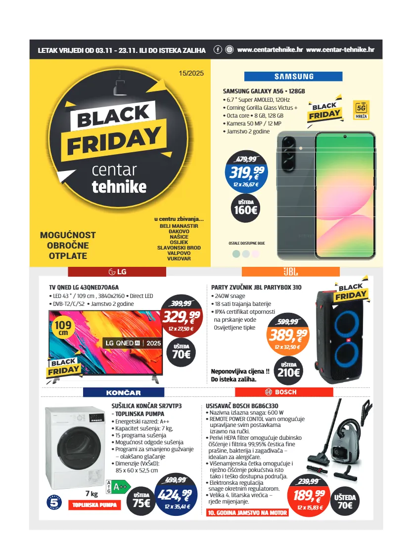 15/2025 u centru zbivanja... beli manastir đakovo našice osijek slavonski brod valpovo vukovar letak vrijedi od 03.11 - 23.11. ili do isteka zaliha www.centartehnike.hr www.centar-tehnike.hr mogućnost obročne otplate € 12 x 28,33 € samsung galaxy a56 • 128gb • 6.7 " super amoled, 120hz • corning gorilla glass victus + octa core 8 gb, 128 gb • • • kamera 50 mp / 12 mp • jamstvo 2 godine 12 x 26,67 € 319,⁹⁹ € 479,99 822,88 ušteda 160€ ostale dostupne boje tv qned lg 43qned70a6a • • led 43 " / 109 cm , 3840x2160 direct led • • dvb-t2/c/s2 jamstvo 2 godine party zvučnik jbl partybox 310 • 240w snage 18 sati trajanja baterije • ipx4 certifikat otpornosti • na prskanje vode osvijetljene tipke 109 cm 12 x 27,50 € 329,⁹⁹ € 399,99 822,88 ušteda 70€ 12 x 32,50 € 389,⁹⁹ € 599,99 822,88 ušteda 210€ neponovljiva cijena !! do isteka zaliha. sušilica končar sr7vtp3 - toplinska pumpa • energetski razred: a++ kapacitet sušenja: 7 kg, • 15 programa sušenja • mogućnost odgode sušenja • programi za smanjeno gužvanje • – olakšano glačanje dimenzije (vxšxd): • 85 x 60 x 52,5 cm toplinska pumpa kg 7 499,99 424,⁹⁹ € 12 x 35,41 € 822,88 ušteda 75€ usisavač bosch bgb6c330 • nazivna izlazna snaga: 600 w remote power contol vam omogućuje • upravljane svim postavkama izravno na ručki. perivi hepa filter omogućuje dubinsko • čišćenje i filtrira 99,95% čestica fine prašine, bakterija i zagađivača – idealan za alergičare. višenamjenska četka omogućuje i • nježno čišćenje pokućstva isto tako i teško dostupna područja. elektronska regulacija • snage okretnim regulatorom. velika 4. litarska vrećica – • rjeđe mijenjanje. ušteda 70€ 12 x 15,83 € 239,99 189,⁹⁹ € 10. godina jamstvo na motor