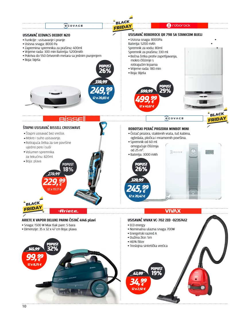 10 • • • • • usisavač ecovacs deebot n20 • funkcije : usisavanje i pranje usisna snaga: 8000 pa • zapremina spremnika za prašinu: 400ml • vrijeme rada: 300 min baterija: 5200mah • pokriva do 550 četvornih metara sa jednim punjenjem • • boja: bijela 339,99 249,⁹⁹ € 12 x 20,83 € popust 26% usisavač roborock qr 798 sa stanicom bijeli • • usisna snaga: 8000pa baterija: 5200 mah • spremnik za vodu: 80ml • spremnik za prašinu: 330 ml • bočna četka protiv zapetljavanja, mokro čišćenje s rotirajućim krpama • vrijeme rada: 180 min • boja: bijela 699,99 499,⁹⁹ € 12 x 41,67 € popust 29% robotski perač prozora winbot mini • čistač prozora, staklenih vrata, tuš kabina, ogledala, pločica i mramornih površina. spremnik od 60 ml • omogućuje čišćenja od 25 m². baterija: 3000 mah • 329,99 245,⁹⁹ € 12 x 20,42 € popust 26% ariete x vapor deluxe parni čistač 4146 plavi • snaga: 1500 w max tlak pare: 5 bara dimenzije: 35 x 32 x 47 cm boja: plava • 145,99 99,⁹⁹ € 12 x 8,25 € popust 32% usisavač vivax vc-702 zeo -02357412 • eco energy nominalna ulazna snaga 700w • energetski razred a • dužina žice: 5m • hepa filter • troslojna sintetička vrećica • 42,99 34,⁹⁹ € 12 x 2,92 € popust 19%
