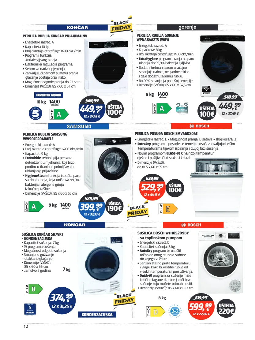 12 perilica rublja končar pr1410mainv • energetski razred: a kapaciteta 10 kg • broj okretaja centrifuge: 1400 okr./min. • program i funkcija • antialergijskog pranja. elektronska regulacija programa. • senzor za nadzor pjenjenja. • zahvaljujući parnom sustavu pranja • glačanje postaje brzo i lako. mogućnost odgode pranja do 23 sata. • dimenzije (vxšxd): 85 x 60 x 54 cm • okr/min 549,99 449,⁹⁹ € 12 x 37,49 € ušteda 100€ inverter motor 10 kg 1400 sušilica bosch wth85209by - sa toplinskom pumpom • energetski razred: d kapacitet sušenja: 8 kg • program će osušiti • autodry točno do onog stupnja suhoće do kojega vi želite. senzori stalno prate temperaturu • i vlagu kako bi zaštitili rublje od visokih temperatura i presušivanja. program za sušenje male • quick40 količine lagane tkanine jamči brzo sušenje koju možete odmah nositi. dimenzije (vxdxš): 85 x 60 x 61,3 cm • ušteda 220€ 819,99 599,⁹⁹ € 12 x 22,86 € d d 8 kg 589,99 399,⁹⁹ € 12 x 33,33 € 9 kg 1400 okr/min • energetski razred: a broj okretaja centrifuge: 1400 okr./min. • kapacitet: 9 kg • • tehnologija pretvara ecobubble deterdžent u mjehuriće, koji brzo prodiru u tkaninu i poboljšavaju uklanjanje prljavštine. funkcija ispušta paru • hygienesteam sa dna bubnja, koja uništava 99,9% bakterija i alergene grinja iz kućne prašine. dimenzije (vxšxd): 85 x 60 x 55 cm • perilica rublja samsung ww90cgc04daele ušteda 190€ perilica rublja gorenje wpna84a2ts (wifi) • energetski razred: a kapaciteta: 8 kg • broj okretaja centrifuge: 1400 okr./min. • program, pranja na paru • extrahygiene uklanja do 99,9% bakterija i gljivica. dodatni tretman parom značajno • smanjuje nabore, neugodne mirise i daje dodatnu svježinu rublju. do 20% smanjenja potrošnje energije. • dimenzije (vxšxd): 85 x 60 x 54,5 cm • ušteda 100€ 8 kg 1400 okr/min 549,99 449 ,⁹⁹ € 12 x 37,49 € sušilica končar sr7vk1 - kondenzacijska kapacitet sušenja: 7 kg • 15 programa sušenja • mogućnost odgode sušenja • smanjeno gužvanje • – olakšano glačanje dimenzije (vxšxd): • 85 x 60 x 56 cm jamstvo 5 godina • kondenzacijska kg 7 374,⁹⁹ € 12 x 31,25 € • • • energetski razred: e mogućnost pranja 13 setova broj košara: 3 program – posuđe se temeljito osuši zahvaljujući višim • extradry temperaturama tijekom ispiranja i duljoj fazi sušenja novim programom na nižoj temperaturi • glass 40 c nježno i pažljivo čisti staklo i kristal dimenzije (vxšxd): • do 81.5 x 60 x 55 cm perilica posuđa bosch smv46kx04e 629,99 529,⁹⁹ € 12 x 44,16 € ušteda 100€