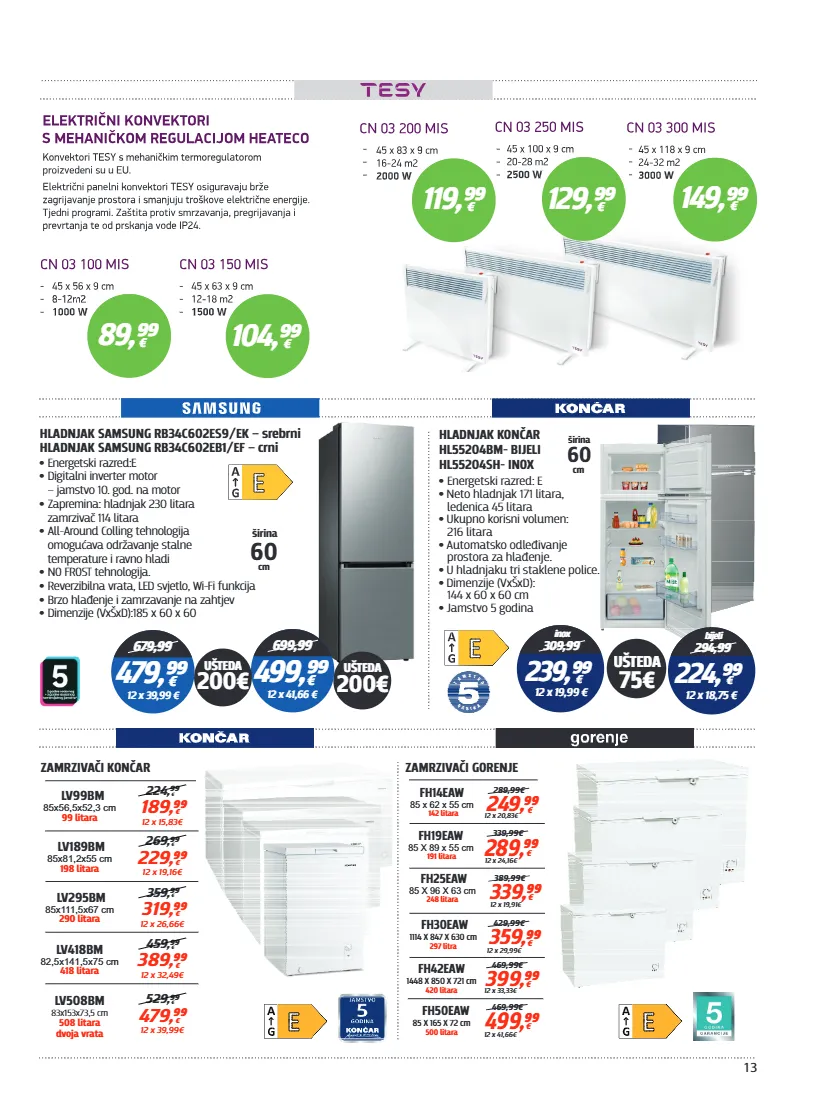 13 149,⁹⁹ € 129,⁹⁹ € 89,⁹⁹ € 119,⁹⁹ € 104,⁹⁹ € • energetski razred:e digitalni inverter motor • – jamstvo 10. god. na motor zapremina: hladnjak 230 litara • zamrzivač 114 litara all-around colling tehnologija • omogućava održavanje stalne temperature i ravno hladi no frost tehnologija. • reverzibilna vrata, led svjetlo, wi-fi funkcija • brzo hlađenje i zamrzavanje na zahtjev • dimenzije (vxšxd):185 x 60 x 60 • cm širina 60 hladnjak samsung rb34c602es9/ek – srebrni hladnjak samsung rb34c602eb1/ef – crni € 12 x 45,83 € 679,99 479,⁰⁰ € 12 x 39,99 € ušteda 200€ € 12 x 45,83 € 699,99 499,⁹⁹ € 12 x 41,66 € ušteda 200€ € 12 x 45,83 € 679,99 479,⁹⁹ € 12 x 39,99 € zamrzivači končar lv99bm 85x56,5x52,3 cm 99 litara lv189bm 85x81,2x55 cm 198 litara lv295bm 85x111,5x67 cm 290 litara lv418bm 82,5x141,5x75 cm 418 litara 12 x 15, 83€ 189, € 99 lv508bm 83x153x73,5 cm 508 litara dvoja vrata 224, € 99 12 x 19, 16€ 229, € 99 269, € 99 12 x 26, 66€ 319, € 99 359, € 99 12 x 32, 49€ 389, € 99 459, € 99 12 x 39,99 € 479, € 99 529, € 99 fh14eaw 85 x 62 x 55 cm 142 litara 249, € 289, 99€ 12 x 20, 83€ 99 fh19eaw 85 x 89 x 55 cm 191 litara 289, € 339, 99€ 12 x 24, 16€ 99 fh25eaw 85 x 96 x 63 cm 248 litara 339, € 389, 99€ 12 x 19, 91€ 99 fh30eaw 1114 x 847 x 630 cm 297 litra zamrzivači gorenje 359, € 429, 99€ 12 x 29, 99€ 99 fh42eaw 1448 x 850 x 721 cm 420 litara 399, € 469, 99€ 12 x 33, 33€ 99 fh50eaw 85 x 165 x 72 cm 500 litara 499, € 469, 99€ 99 12 x 41, 66€ • energetski razred: e neto hladnjak 171 litara, • ledenica 45 litara ukupno korisni volumen: • 216 litara automatsko odleđivanje • prostora za hlađenje. u hladnjaku tri staklene police. • dimenzije (vxšxd): • 144 x 60 x 60 cm • jamstvo 5 godina 60 širina cm hladnjak končar hl55204bm- bijeli hl55204sh- inox 309,99 247,⁹⁹ € 12 x 20,66 € sivi 299,99 239,⁹⁹ € 12 x 19,99 € bijeli 309,99 239,⁹⁹ € 12 x 19,99 € inox 294,99 224,⁹⁹ € 12 x 18,75 € bijeli popust 20% ušteda 75€