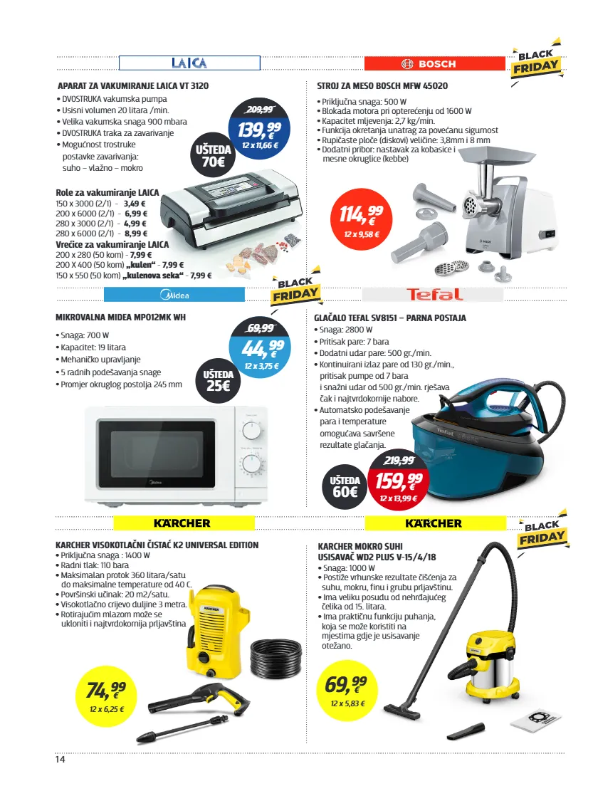 14 aparat za vakumiranje laica vt 3120 • dvostruka vakumska pumpa usisni volumen 20 litara /min. • velika vakumska snaga 900 mbara • dvostruka traka za zavarivanje • mogućnost trostruke • postavke zavarivanja: suho – vlažno – mokro role za vakumiranje laica 150 x 3000 (2/1) - 3,49 € 200 x 6000 (2/1) - 6,99 € 4,99 280 x 3000 (2/1) - € 8,99 280 x 6000 (2/1) - € vrećice za vakumiranje laica 200 x 280 (50 kom) - 7,99 € 200 x 400 (50 kom) - „kulen“ 7,99 € 7,99 150 x 550 (50 kom) - „kulenova seka“ € 209,99 139,⁹⁹ € 12 x 11,66 € ušteda 70€ karcher mokro suhi usisavač wd2 plus v-15/4/18 • snaga: 1000 w postiže vrhunske rezultate čišćenja za • suhu, mokru, finu i grubu prljavštinu. ima veliku posudu od nehrđajućeg • čelika od 15. litara. ima praktičnu funkciju puhanja, • koja se može koristiti na mjestima gdje je usisavanje otežano. 69,⁹⁹ € 12 x 5,83 € stroj za meso bosch mfw 45020 • priključna snaga: 500 w • blokada motora pri opterećenju od 1600 w • kapacitet mljevenja: 2,7 kg/min. • funkcija okretanja unatrag za povećanu sigurnost • rupičaste ploče (diskovi) veličine: 3,8mm i 8 mm • dodatni pribor: nastavak za kobasice i mesne okruglice (kebbe) 114,⁹⁹ € 12 x 9,58 € glačalo tefal sv8151 – parna postaja • snaga: 2800 w pritisak pare: 7 bara • dodatni udar pare: 500 gr./min. • kontinuirani izlaz pare od 130 gr./min., • pritisak pumpe od 7 bara i snažni udar od 500 gr./min. rješava čak i najtvrdokornije nabore. automatsko podešavanje • para i temperature omogućava savršene rezultate glačanja. 219,99 159,⁹⁹ € 12 x 13,99 € ušteda 60€ karcher visokotlačni čistać k2 universal edition • priključna snaga : 1400 w radni tlak: 110 bara • maksimalan protok 360 litara/satu • do maksimalne temperature od 40 c. površinski učinak: 20 m2/satu. • visokotlačno crijevo duljine 3 metra. • rotirajućim mlazom može se • ukloniti i najtvrdokornija prljavština 74,⁹⁹ € 12 x 6,25 € • snaga: 700 w kapacitet: 19 litara • mehaničko upravljanje • 5 radnih podešavanja snage • promjer okruglog postolja 245 mm • mikrovalna midea mp012mk wh 69,99 44,⁹⁹ € 12 x 3,75 € ušteda 25€