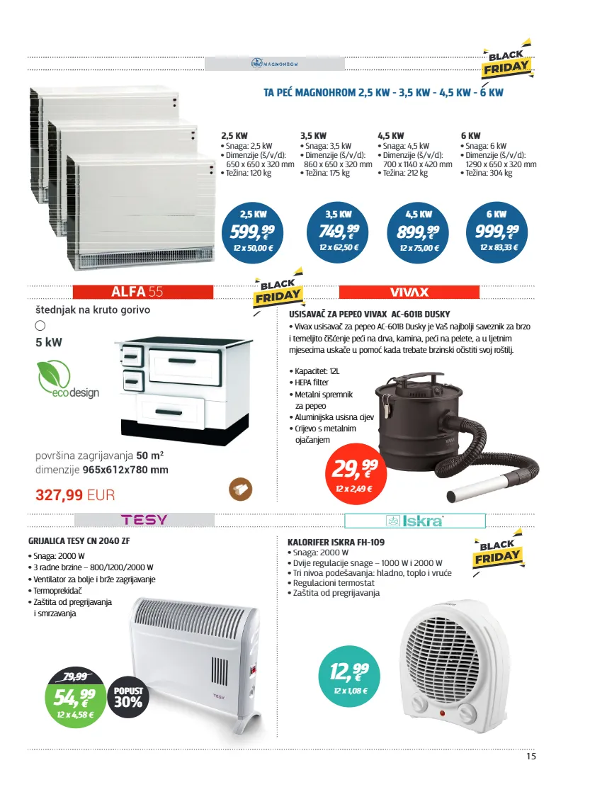 15 grijalica tesy cn 2040 zf • snaga: 2000 w • 3 radne brzine – 800/1200/2000 w • ventilator za bolje i brže zagrijavanje • termoprekidač • zaštita od pregrijavanja i smrzavanja 79,99 54,⁹⁹ € 12 x 4,58 € popust 30% 29,⁹⁹ € 12 x 2,49 € usisavač za pepeo vivax ac-601b dusky • vivax usisavač za pepeo ac-601b dusky je vaš najbolji saveznik za brzo i temeljito čišćenje peći na drva, kamina, peći na pelete, a u ljetnim mjesecima uskače u pomoć kada trebate brzinski očistiti svoj roštilj. • kapacitet: 12l • hepa filter • metalni spremnik za pepeo • aluminijska usisna cijev • crijevo s metalnim ojačanjem kalorifer iskra fh-109 • snaga: 2000 w dvije regulacije snage – 1000 w i 2000 w • tri nivoa podešavanja: hladno, toplo i vruće • regulacioni termostat • zaštita od pregrijavanja • 12,⁹⁹ € 12 x 1,08 € 749,⁹⁹ € 12 x 62,50 € 599,⁹⁹ € 12 x 50,00 € 2,5 kw 3,5 kw 999,⁹⁹ € 12 x 83,33 € 899,⁹⁹ € 12 x 75,00 € 4,5 kw 6 kw 2,5 kw • snaga: 2,5 kw dimenzije (š/v/d): • 650 x 650 x 320 mm težina: 120 kg • ta peć magnohrom 2,5 kw - 3,5 kw - 4,5 kw - 6 kw • snaga: 3,5 kw dimenzije (š/v/d): • 860 x 650 x 320 mm težina: 175 kg • • snaga: 4,5 kw dimenzije (š/v/d): • 700 x 1140 x 420 mm težina: 212 kg • • snaga: 6 kw dimenzije (š/v/d): • 1290 x 650 x 320 mm težina: 304 kg • 3,5 kw 4,5 kw 6 kw