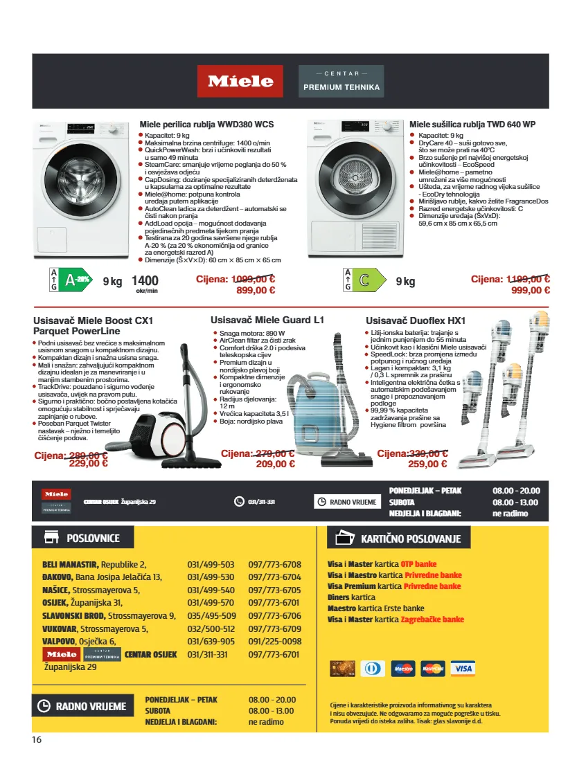 beli manastir, republike 2, 031/499-503 097/773-6708 đakovo, bana josipa jelačića 13, 031/499-530 097/773-6704 našice, strossmayerova 5, 031/499-540 097/773-6705 osijek, županijska 31, 031/499-570 097/773-6701 slavonski brod, strossmayerova 9, 035/495-509 097/773-6706 vukovar , strossmayerova 5, 032/500-512 097/773-6709 valpovo , osječka 6, 031/639-905 091/225-0098 centar osijek 311 331 031/ - 097/773-6701 županijska 29 poslovnice 08.00 - 20.00 ponedjeljak – petak - subota 08.00 13.00 nedjelja blagdani i : ne radimo cijene i karakteristike proizvoda informativnog su karaktera i nisu obvezujuće. ne odgovaramo za moguće pogreške u tisku. ponuda vrijedi do isteka zaliha. tisak: glas slavonije d.d. radno vrijeme kartično poslovanje visa master kartica i otp banke visa maestro i kartica privredne banke visa kartica premium privredne banke diners kartica kartica erste banke maestro kartica visa master i zagrebačke banke 16 radno vrijeme 08.00 - 20.00 ponedjeljak – petak - subota 08.00 13.00 nedjelja blagdani i : ne radimo centar osijek županijska 29 031/311-331 usisavač miele boost cx1 parquet powerline cijena: 289,00 € 229,00 € 9 kg 1400 okr/min € miele perilica rublja wwd380 wcs kapacitet: 9 kg maksimalna brzina centrifuge: 1400 o/min quickpowerwash: brzi i učinkoviti rezultati u samo 49 minuta steamcare: smanjuje vrijeme peglanja do 50 % i osvježava odjeću capdosing: doziranje specijaliziranih deterdženata u kapsulama za optimalne rezultate miele@home: potpuna kontrola uređaja putem aplikacije autoclean ladica za deterdžent – automatski se čisti nakon pranja addload opcija – mogućnost dodavanja pojedinačnih predmeta tijekom pranja testirana za 20 godina savršene njege rublja a-20 % (za 20 % ekonomičnija od granice za energetski razred a) dimenzije (š×v×d): 60 cm × 85 cm × 65 cm cijena: 1099,00 € 899,00 € -20% litij-ionska baterija: trajanje s jednim punjenjem do 55 minuta učinkovit kao i klasični miele usisavači speedlock: brza promjena između potpunog i ručnog uređaja lagan i kompaktan: 3,1 kg / 0,3 l spremnik za prašinu inteligentna električna četka s automatskim podešavanjem snage i prepoznavanjem podloge 99,99 % kapaciteta zadržavanja prašine sa hygiene filtrom površina usisavač duoflex hx1 cijena:339,00 € 259,00 € 9 kg € mi e l e su šili ca rub l ja t wd 64 0 wp cijena: 1199,00 € 999,00 € kapacitet: 9 kg drycare 40 – suši gotovo sve, što se može prati na 40°c brzo sušenje pri najvišoj energetskoj učinkovitosti – ecospeed miele@home – pametno umreženi za više mogućnosti ušteda, za vrijeme radnog vijeka sušilice - ecodry tehnologija mirišljavo rublje, kakvo želite fragrancedos razred energetske učinkovitosti: c dimenzije uređaja (šxvxd): 59,6 cm x 85 cm x 65,5 cm podni usisavač bez vrećice s maksimalnom usisnom snagom u kompaktnom dizajnu. kompaktan dizajn i snažna usisna snaga. mali i snažan: zahvaljujući kompaktnom dizajnu idealan je za manevriranje i u manjim stambenim prostorima. trackdrive: pouzdano i sigurno vođenje usisavača, uvijek na pravom putu. sigurno i praktično: bočno postavljena kotačića omogućuju stabilnost i sprječavaju zapinjanje o rubove. poseban parquet twister nastavak – nježno i temeljito čišćenje podova. usisavač miele guard l1 snaga motora: 890 w airclean filtar za čisti zrak comfort drška 2.0 i podesiva teleskopska cijev premium dizajn u nordijsko plavoj boji kompaktne dimenzije i ergonomsko rukovanje radijus djelovanja: 12 m vrećica kapaciteta 3,5 l boja: nordijsko plava cijena: 279,00 € 209,00 €