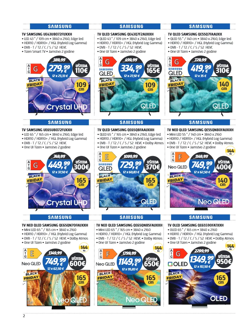 2 tv samsung ue43u8072fuxxh • • led 43 " / 109 cm 3840 x 2160, edge led hdr10 / hdr10+ / hgl (hybrid log gamma) • dvb - t / t2 / c / s / s2 hevc • tizen smart tv jamstvo 2 godine • • 389,99 € 12 x 23,33 € 279,⁹⁹ 109 cm ušteda 110€ tv qled samsung qe43q7f2auxxh • • qled 43 " / 109 cm 3840 x 2160, edge led hdr10 / hdr10+ / hgl (hybrid log gamma) • dvb - t / t2 / c / s / s2 hevc • one ui tizen jamstvo 2 godine • • 499,99 € 12 x 27,92 € 334,⁹⁹ ušteda 165€ 729,99 € 12 x 35 € 419,⁹⁹ ušteda 310€ 109 cm tv qled samsung qe55q7faauxx • • qled 55 " / 140 cm 3840 x 2160, edge led hdr10 / hdr10+ / hgl (hybrid log gamma) • dvb - t / t2 / c / s / s2 hevc • one ui tizen jamstvo 2 godine • • 140 cm tv samsung ue65u8072fuxxh • • led 65 " / 165 cm 3840 x 2160, edge led hdr10 / hdr10+ / hgl (hybrid log gamma) • dvb - t / t2 / c / s / s2 hevc • one ui tizen jamstvo 2 godine • • 749,99 € 12 x 37,50 € 449,⁹⁹ ušteda 300€ 165 cm tv qled samsung qe65q8faauxxh • • qled 65 " / 165 cm 3840 x 2160, edge led hdr10 / hdr10+ / hgl (hybrid log gamma) • dvb - t / t2 / c / s / s2 hevc dolby atmos • • one ui tizen jamstvo 2 godine • • 1099,99 € 12 x 60,83 € 729,⁹⁹ ušteda 370€ 165 cm tv neo qled samsung qe55qn80fauxxh • • mini led 55 " / 140 cm 3840 x 2160 hdr10 / hdr10+ / hgl (hybrid log gamma) • dvb - t / t2 / c / s / s2 hevc dolby atmos • • one ui tizen jamstvo 2 godine • • 1149,99 € 12 x 62,50 € 749,⁹⁹ ušteda 400€ 144 hz 140 cm tv neo qled samsung qe65qn70fauxxh • • mini led 65 " / 165 cm 3840 x 2160 hdr10 / hdr10+ / hgl (hybrid log gamma) • dvb - t / t2 / c / s / s2 hevc dolby atmos • • one ui tizen jamstvo 2 godine • • 1349,99 € 12 x 62,50 € 749,⁹⁹ ušteda 600€ 144 hz 165 cm tv neo qled samsung qe65qn85fauxxh • • mini led 65 " / 165 cm 3840 x 2160 hdr10 / hdr10+ / hgl (hybrid log gamma) • dvb - t / t2 / c / s / s2 hevc dolby atmos • • one ui tizen jamstvo 2 godine • • 165 cm 1799,99 € 12 x 95,83 € 1149,⁹⁹ ušteda 650€ 144 hz tv oled samsung qe65s90fatxxh • • oled 65 " / 165 cm 3840 x 2160 hdr10 / hdr10+ / hgl (hybrid log gamma) • dvb - t / t2 / c / s / s2 hevc dolby atmos • • one ui tizen jamstvo 2 godine • • 2299,99 € 12 x 112,50 € 1349,⁹⁹ ušteda 950€ 144 hz 165 cm