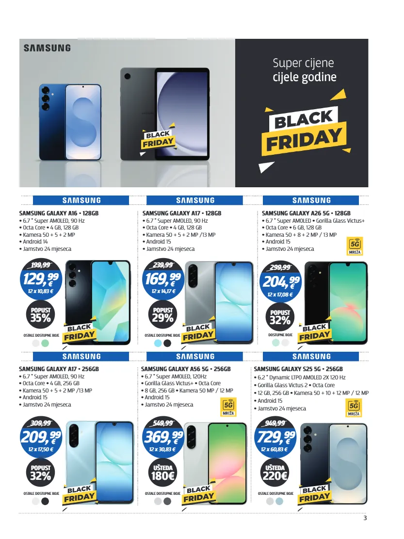 3 SAMSUNG GALAXY A16 • 128GB • 6.7 " Super AMOLED, 90 Hz Octa Core 4 GB, 128 GB • • Kamera 50 + 5 + 2 MP • Android 14 • Jamstvo 24 mjeseca • 199,99 129,⁹⁹ € 12 x 10,83 € POPUST 35% OSTALE DOSTUPNE BOJE SAMSUNG GALAXY A17 • 128GB • 6.7 " Super AMOLED, 90 Hz Octa Core 4 GB, 128 GB • • Kamera 50 + 5 + 2 MP /13 MP • Android 15 • Jamstvo 24 mjeseca • 239,99 169,⁹⁹ € 12 x 14,17 € POPUST 29% OSTALE DOSTUPNE BOJE 299,99 204,⁹⁹ € 12 x 17,08 € POPUST 32% DOSTUPNE BOJE SAMSUNG GALAXY A26 5G • 128GB • • 6.7 " Super AMOLED Gorilla Glass Victus+ Octa Core 6 GB, 128 GB • • Kamera 50 + 8 + 2 MP / 13 MP • Android 15 • Jamstvo 24 mjeseca • 309,99 209,⁹⁹ € 12 x 17,50 € POPUST 32% OSTALE DOSTUPNE BOJE SAMSUNG GALAXY A17 • 256GB • 6.7 " Super AMOLED, 90 Hz Octa Core 4 GB, 256 GB • • Kamera 50 + 5 + 2 MP /13 MP • Android 15 • Jamstvo 24 mjeseca • 549,99 369,⁹⁹ € 12 x 30,83 € UŠTEDA 180€ OSTALE DOSTUPNE BOJE SAMSUNG GALAXY A56 5G • 256GB • 6.7 " Super AMOLED, 120Hz Gorilla Glass Victus+ Octa Core • • • • 8 GB, 256 GB Kamera 50 MP / 12 MP • Android 15 Jamstvo 24 mjeseca • 949,99 729,⁹⁹ € 12 x 60,83 € UŠTEDA 220€ OSTALE DOSTUPNE BOJE SAMSUNG GALAXY S25 5G • 256GB • 6.2 " Dynamic LTPO AMOLED 2X 120 Hz Gorilla Glass Victus 2 Octa Core • • • • 12 GB, 256 GB Kamera 50 + 10 + 12 MP / 12 MP • Android 15 Jamstvo 24 mjeseca •