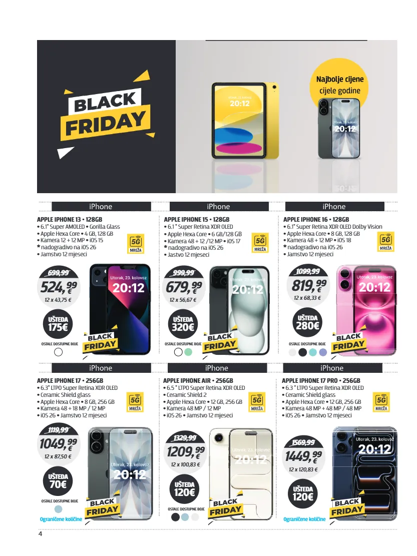 4 APPLE IPHONE 13 • 128GB • • 6.1" Super AMOLED Gorilla Glass Apple Hexa Core 4 GB, 128 GB • • Kamera 12 + 12 MP iOS 15 • • * nadogradivo na iOS 26 Jamstvo 12 mjeseci • 699,99 524,⁹⁹ € 12 x 43,75 € UŠTEDA 175€ OSTALE DOSTUPNE BOJE 999,99 679,⁹⁹ € 12 x 56,67 € UŠTEDA 320€ APPLE IPHONE 15 • 128GB • 6.1 " Super Retina XDR OLED Apple Hexa Core 6 GB/128 • • GB • • Kamera 48 + 12 /12 MP iOS 17 nadogradivo na iOS 26 * Jastvo 12 mjeseci • APPLE IPHONE 16 • 128GB • 6.1" Super Retina XDR OLED Dolby Vision Apple Hexa Core 8 GB, 128 GB • • Kamera 48 + 12 MP iOS 18 • • nadogradivo na iOS 26 * Jamstvo 12 mjeseci • 1099,99 819,⁹⁹ € 12 x 68,33 € UŠTEDA 280€ OSTALE DOSTUPNE BOJE OSTALE DOSTUPNE BOJE Ograničene količine 1119,99 1049,⁹⁹ € 12 x 87,50 € UŠTEDA 70€ OSTALE DOSTUPNE BOJE 1329,99 1209,⁹⁹ € 12 x 100,83 € UŠTEDA 120€ OSTALE DOSTUPNE BOJE 1569,99 1449,⁹⁹ € 12 x 120,83 € UŠTEDA 120€ APPLE IPHONE 17 • 256GB • 6.3" LTPO Super Retina XDR OLED • Ceramic Shield glass Apple Hexa Core 8 GB, 256 GB • • Kamera 48 + 18 MP / 12 MP • • • iOS 26 Jamstvo 12 mjeseci APPLE IPHONE AIR • 256GB • 6.5 " LTPO Super Retina XDR OLED • Ceramic Shield 2 Apple Hexa Core 12 GB, 256 GB • • Kamera 48 MP / 12 MP • • • iOS 26 Jamstvo 12 mjeseci APPLE IPHONE 17 PRO • 256GB • 6.3 " LTPO Super Retina XDR OLED • Ceramic Shield glass Apple Hexa Core 12 GB, 256 GB • • Kamera 48 MP + 48 MP / 48 MP • • • iOS 26 Jamstvo 12 mjeseci Ograničene količine