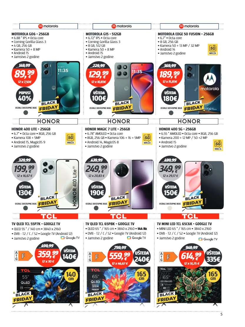 5 ušteda 100€ motorola g15 • 512gb • • 6.72" ips octa core • corning gorilla glass 3 8 gb, 512 gb • kamera 50 + 8 mp • android 15 • jamstvo 2 godine • ostale dostupne boje 229,99 129,⁹⁹ € 12 x 10,83€ popust 40% ostale dostupne boje 149,99 89,⁹⁹ € 12 x 7,50€ ušteda 180€ ostale dostupne boje 369,99 189,⁹⁹ € 12 x 15,83€ motorola edge 50 fusion • 256gb • • 6.7" octa core • 8 gb, 256 gb kamera 50 + 13 mp / 32 mp • android 14 • jamstvo 2 godine • motorola g06 • 256gb • • 6.88 " ips octa core • corning gorilla glass 3 4 gb, 256 gb • kamera 50 + 8 mp • android 15 • jamstvo 2 godine • honor 400 lite • 256gb • • • 6.7" octa core 8gb, 256 gb kamera 108 + 5mp • android 15, magicos 9 • jamstvo 2 godine • 329,99 199,⁹⁹ € 12 x 16,67 € ušteda 130€ ostale dostupne boje honor magic 7 lite • 256gb • • 6.78" amoled octa core • • 8gb, 256 gb kamera 106 + 16 + 5mp android 14, magicos 8 • jamstvo 2 godine • 439,99 249,⁹⁹ € 12 x 20,83 € ušteda 190€ ostale dostupne boje honor 400 5g • 256gb • • • 6.55 " amoled octa core 8gb, 256 gb • kamera 200 + 12 mp / 50 +2 mp android 15 • jamstvo 2 godine • 499,99 349,⁹⁹ € 12 x 29,17 € ušteda 150€ ostale dostupne boje tv qled tcl 55p7k • google tv • • qled 55 " / 140 cm 3840 x 2160 dvb - t2 / c / s2 google tv (android 12) • • jamstvo 2 godine • 499,99 € 12 x 30 € 359,⁹⁹ 140 cm ušteda 140€ tv qled tcl 65p8k • google tv • • • 144 hz qled 65 " / 165 cm 3840 x 2160 dvb - t2 / c / s2 google tv (android 12) • • jamstvo 2 godine • 799,99 € 12 x 46,67 € ušteda 240€ 559,⁹⁹ 165 cm tv mini led tcl 65c6k • google tv • • mini led 65 " / 165 cm 3840 x 2160 dvb - t2 / c / s2 google tv (android 12) • • jamstvo 2 godine • 949,99 € 12 x 51,25 € ušteda 335€ 614,⁹⁹ 165 cm