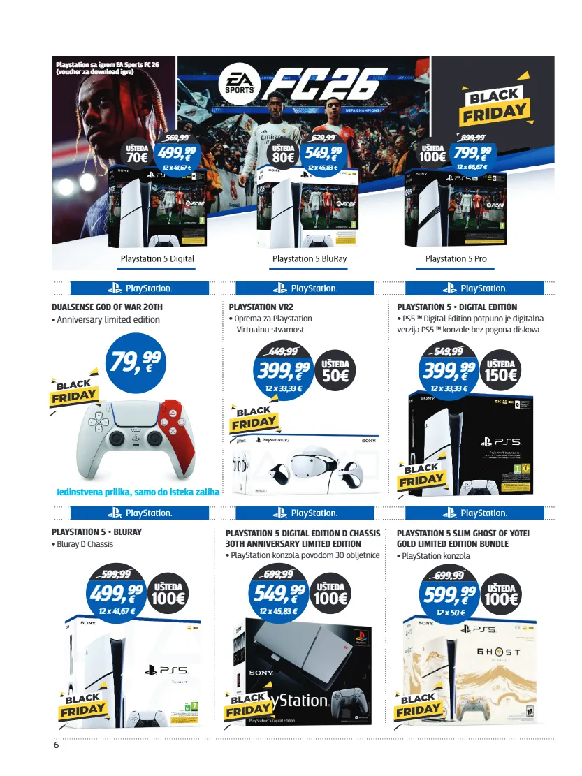 6 Playstation sa igrom EA Sports FC 26 (voucher za download igre) 569,99 499,⁹⁹ € 12 x 41,67 € UŠTEDA 70€ 629,99 549,⁹⁹ € 12 x 45,83 € UŠTEDA 80€ 899,99 799,⁹⁹ € 12 x 66,67 € UŠTEDA 100€ DUALSENSE GOD OF WAR 20TH • Anniversary limited edition Jedinstvena prilika, samo do isteka zaliha 79,⁹⁹ € PLAYSTATION VR2 • Oprema za Playstation Virtualnu stvarnost 399,⁹⁹ € 12 x 33,33 € 449,99 UŠTEDA 50€ PLAYSTATION 5 • DIGITAL EDITION • PS5 ™ Digital Edition potpuno je digitalna verzija PS5 ™ konzole bez pogona diskova. 399,⁹⁹ € 12 x 33,33 € 549,99 UŠTEDA 150€ 499,⁹⁹ € 12 x 41,67 € 599,99 UŠTEDA 100€ PLAYSTATION 5 • BLURAY • Bluray D Chassis PLAYSTATION 5 DIGITAL EDITION D CHASSIS 30TH ANNIVERSARY LIMITED EDITION • PlayStation konzola povodom 30 obljetnice 549,⁹⁹ € 12 x 45,83 € 699,99 UŠTEDA 100€ PLAYSTATION 5 SLIM GHOST OF YOTEI GOLD LIMITED EDITION BUNDLE • PlayStation konzola 599,⁹⁹ € 12 x 50 € 699,99 UŠTEDA 100€