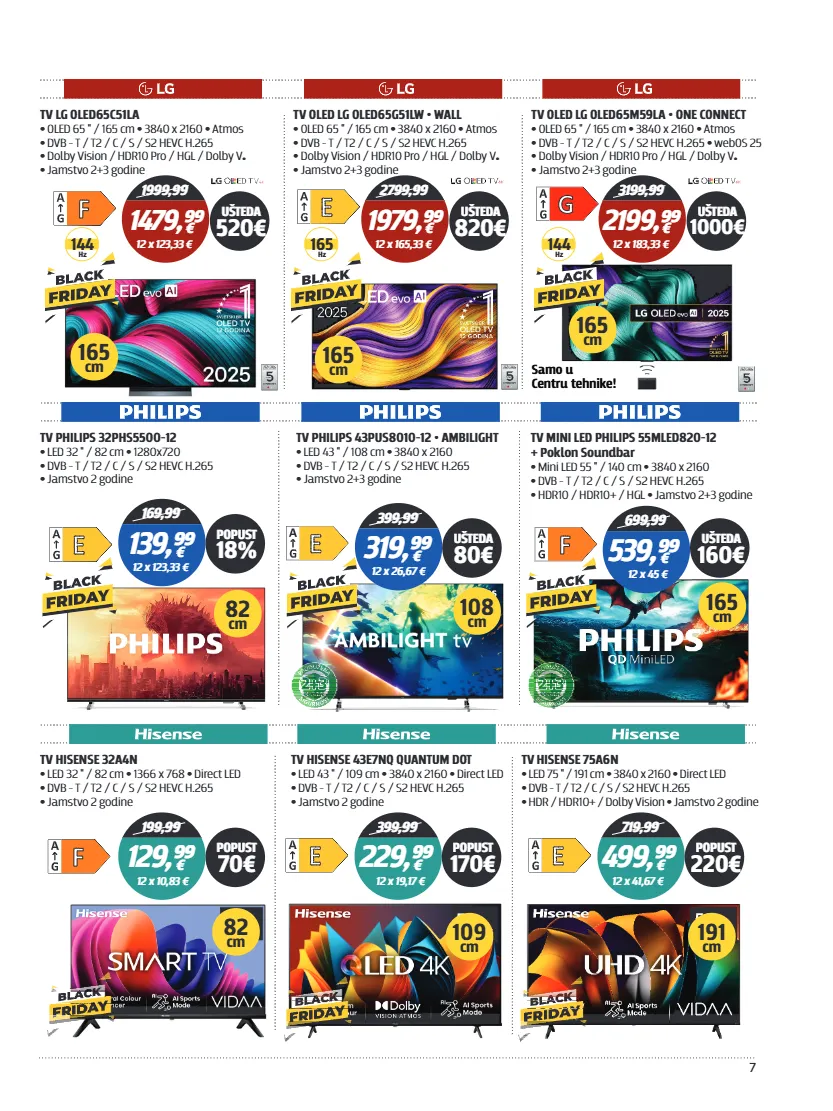 7 tv lg oled65c51la • • • oled 65 " / 165 cm 3840 x 2160 atmos dvb - t / t2 / c / s / s2 hevc h.265 • dolby vision / hdr10 pro / hgl / dolby v • . • jamstvo 2+3 godine 1999,99 1479,⁹⁹ € 12 x 123,33 € 165 cm ušteda 520€ 144 hz tv oled lg oled65g51lw • wall • • • oled 65 " / 165 cm 3840 x 2160 atmos dvb - t / t2 / c / s / s2 hevc h.265 • dolby vision / hdr10 pro / hgl / dolby v • . • jamstvo 2+3 godine 2799,99 1979,⁹⁹ € 12 x 165,33 € ušteda 820€ 165 hz 165 cm tv oled lg oled65m59la • one connect • • • oled 65 " / 165 cm 3840 x 2160 atmos dvb - t / t2 / c / s / s2 hevc h.265 webos 25 • • dolby vision / hdr10 pro / hgl / dolby v • . • jamstvo 2+3 godine 3199,99 2199,⁹⁹ € 12 x 183,33 € ušteda 1000€ 144 hz samo u centru tehnike! 165 cm tv philips 32phs5500-12 • • led 32 " / 82 cm 1280x720 dvb - t / t2 / c / s / s2 hevc h.265 • • jamstvo 2 godine tv philips 43pus8010-12 • ambilight • • led 43 " / 108 cm 3840 x 2160 dvb - t / t2 / c / s / s2 hevc h.265 • • jamstvo 2+3 godine 169,99 139,⁹⁹ € 12 x 123,33 € popust 18% 82 cm 399,99 319,⁹⁹ € 12 x 26,67 € ušteda 80€ 108 cm tv mini led philips 55mled820-12 + poklon soundbar • • mini led 55 " / 140 cm 3840 x 2160 dvb - t / t2 / c / s / s2 hevc h.265 • • • hdr10 / hdr10+ / hgl jamstvo 2+3 godine 699,99 539,⁹⁹ € 12 x 45 € ušteda 160€ 165 cm tv hisense 32a4n • • • led 32 " / 82 cm 1366 x 768 direct led dvb - t / t2 / c / s / s2 hevc h.265 • • jamstvo 2 godine 199,99 129,⁹⁹ € 12 x 10,83 € popust 70€ 82 cm tv hisense 43e7nq quantum dot • • • led 43 " / 109 cm 3840 x 2160 direct led dvb - t / t2 / c / s / s2 hevc h.265 • • jamstvo 2 godine 399,99 229,⁹⁹ € 12 x 19,17 € popust 170€ 109 cm tv hisense 75a6n • • • led 75 " / 191 cm 3840 x 2160 direct led dvb - t / t2 / c / s / s2 hevc h.265 • • • hdr / hdr10+ / dolby vision jamstvo 2 godine 719,99 499,⁹⁹ € 12 x 41,67 € popust 220€ 191 cm
