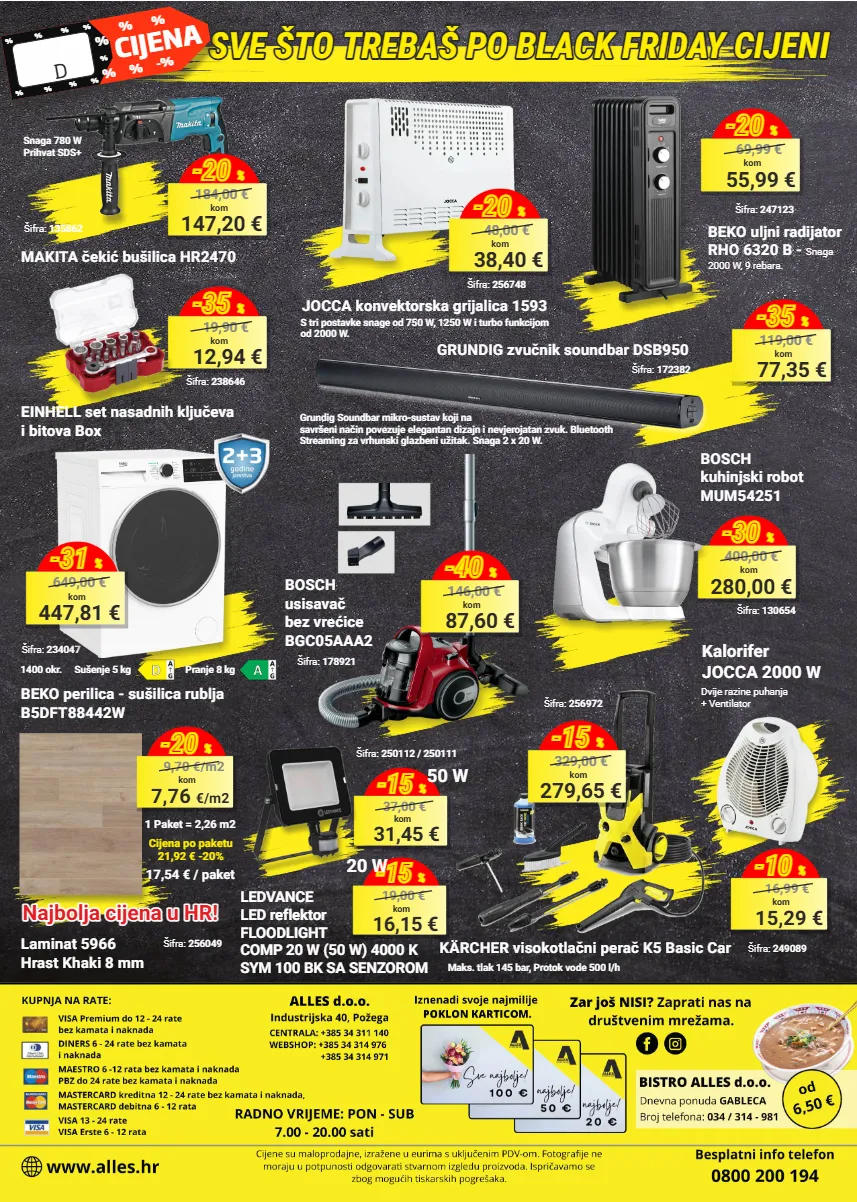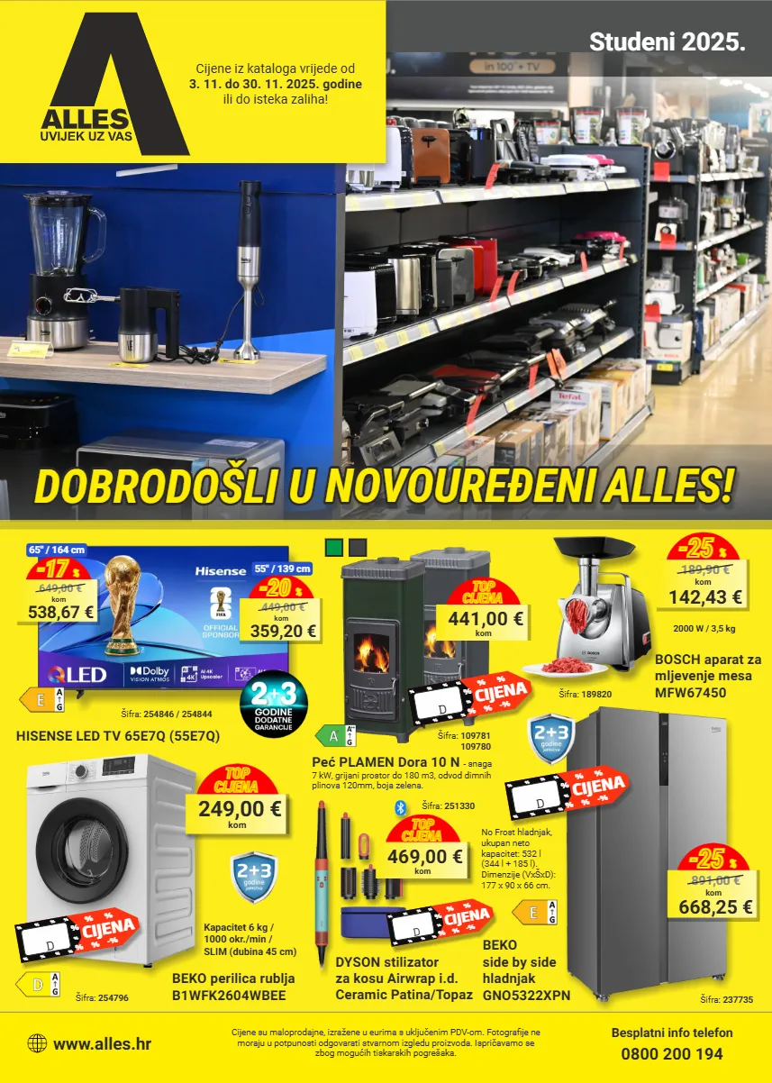 cijene iz kataloga vrijede od 3. 11. do 30. 11. 2025. godine ili do isteka zaliha! cijene su maloprodajne, izražene u eurima s uključenim pdv-om. fotografije ne moraju u potpunosti odgovarati stvarnom izgledu proizvoda. ispričavamo se zbog mogućih tiskarskih pogrešaka. besplatni info telefon 0800 200 194 249,00 € kom top cijena šifra: 254796 beko perilica rublja b1wfk2604wbee kapacitet 6 kg / 1000 okr./min / slim (dubina 45 cm) novouređeni novouređeni novouređeni alles! alles! alles! dobrodošli u dobrodošli u dobrodošli u šifra: 254846 / 254844 359,20 € kom 449,00 € -20 % 55" / 139 cm hisense led tv 65e7q (55e7q) www.alles.hr 142,43 € kom 189,90 € -25 % šifra: 189820 bosch aparat za mljevenje mesa mfw67450 studeni 2025. 2000 w / 3,5 kg beko side by side hladnjak gno5322xpn šifra: 237735 no frost hladnjak, ukupan neto kapacitet: 532 l (344 l + 185 l). dimenzije (vxšxd): 177 x 90 x 66 cm. 538,67 € kom 649,00 € -17 % 65" / 164 cm black friday cijena % % % % % -% % % % % % % % % % 668,25 € kom 891,00 € -25 % šifra: 109781 109780 peć plamen dora 10 n - snaga 7 kw, grijani prostor do 180 m3, odvod dimnih plinova 120mm, boja zelena. 441,00 € kom top cijena black friday cijena % % % % % -% % % % % % % % % % black friday cijena % % % % % -% % % % % % % % % % šifra: 251330 469,00 € kom top cijena dyson stilizator za kosu airwrap i.d. ceramic patina/topaz black friday cijena % % % % % -% % % % % % % % % %