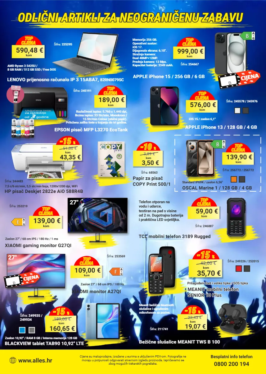 odlični artikli za neograničenu zabavu odlični artikli za neograničenu zabavu odlični artikli za neograničenu zabavu cijene su maloprodajne, izražene u eurima s uključenim pdv-om. fotografije ne moraju u potpunosti odgovarati stvarnom izgledu proizvoda. ispričavamo se zbog mogućih tiskarskih pogrešaka. besplatni info telefon 0800 200 194 www.alles.hr 999,00 € kom top cijena apple iphone 15 / 256 gb / 6 gb šifra: 254667 memorija 256 gb. operativni sustav: ios 17. dijagonala ekrana: 6.10". stražnja kamera: dual 48mp+12mp. prednja kamera: 12 mpx. kapacitet baterije: 3349 mah. 576,00 € kom top cijena apple iphone 13 / 128 gb / 4 gb šifra: 245578 / 245976 ios 15 / zaslon 6,1" 139,90 € kom top cijena oscal marine 1 / 128 gb / 4 gb šifra: 256773 / 256772 standard ip69k / zaslon 6,56" 59,00 € kom top cijena tcl mobilni telefon 3189 rugged šifra: 246887 telefon otporan na vodu i udarce, testiran na pad s visine od 2 m. dugotrajna baterija i praktična led svjetiljka. meanit mobilni telefon meanit mobilni telefon senior 10 plus senior 10 plus meanit mobilni telefon senior 10 plus šifra: 249226 / 252015 prilagođeni font i velike tipke / sos tipka prilagođeni font i velike tipke / sos tipka prilagođeni font i velike tipke / sos tipka 35,70 € kom 42,00 € -15 % bežične slušalice meanit tws b 100 šifra: 211741 19,07 € kom 22,43 € -15 % šifra: 249935 / 249934 xiaomi monitor a27qi zaslon 27" / 68 cm ips / 100 hz 109,00 € kom top cijena 27" 590,48 € kom top cijena lenovo prijenosno računalo ip 3 15aba7, 82rn0079sc šifra: 225295 amd ryzen 3 5425u / 8 gb ram / 512 gb ssd / free dos xiaomi gaming monitor g27qi šifra: 253219 zaslon 27" / 68 cm ips / 180 hz / 1 ms 139,00 € kom top cijena 27" hp pisač deskjet 2822e aio 588r4b šifra: 244483 7,5 c/b str/min, 5,5 str/min boja, 1200x1200 dpi, wifi 43,35 € kom 51,00 € -15 % 160,65 € kom 189,00 € -15 % šifra: 245191 189,00 € kom top cijena 3,50 € kom 3,89 € -10 % papir za pisač copy print 500/1 šifra: 68563 epson pisač mfp l3270 ecotank razlučivost ispisa: 5.760 x 1.440 dpi, brzina ispisa: 33 str/min, monokrom / 15 str/min colour (obični papir). priložena zaliha tinte u trajanju do tri godine. šifra: 253569 blackview tablet tab90 10,92" lte zaslon 10,92" / ram 8 gb / interna memorija 128 gb meanit bežične bluetooth slušalice i ugrađenim mikrofonom za pozive. black friday cijena % % % % % -% % % % % % % % % % black friday cijena % % % % % -% % % % % % % % % %