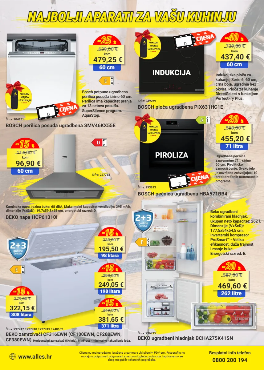 cijene su maloprodajne, izražene u eurima s uključenim pdv-om. fotografije ne moraju u potpunosti odgovarati stvarnom izgledu proizvoda. ispričavamo se zbog mogućih tiskarskih pogrešaka. besplatni info telefon 0800 200 194 www.alles.hr najbolji aparati za vašu kuhinju najbolji aparati za vašu kuhinju najbolji aparati za vašu kuhinju beko zamrzivači cf316ewn (cf100ewn, cf200ewn, cf380ewn) šifra: 237747 / 237748 / 237749 / 248162 horizontalni zamrzivač (škrinja), minfrost - minimalno nakupljanje leda. 98 litara 195,50 € kom 230,00 € -15 % 198 litara 249,05 € kom 293,00 € -15 % 371 litra 381,65 € kom 449,00 € -15 % 308 litara 322,15 € kom 379,00 € -15 % beko ugradbeni hladnjak bcha275k41sn šifra: 236715 262 litre 469,60 € kom 587,00 € -20 % beko ugradbeni kombinirani hladnjak, ukupan neto kapacitet: 262 l. dimenzije (vxšxd): 177,5x54x54,5 cm. inverterski kompresor prosmart™ - velika efikasnost, duža trajnost i manje buke. energetski razred: e. bosch ploča ugradbena pix631hc1e šifra: 239269 60 cm 437,40 € kom 729,00 € -40 % indukcijska ploča za kuhanje, serie 6, 60 cm, crna boja, ugradnja bez okvira. ploča za kuhanje directselect s funkcijom perfectfry plus. bosch pećnica ugradbena hba571bb4 šifra: 253813 71 litra 455,20 € kom 569,00 € -20 % ugradbena pećnica zapremnine 71 l, širine 60 cm. pirolitičko samočišćenje. svako jelo je savršeno zahvaljujući 10 predodređenih automatskih programa. indukcija piroliza beko napa hcp61310i šifra: 227763 kaminska napa, razina buke: 68 dba, maksimalni kapacitet ventilacije: 395 m³/h, dimenzije (vxšxd): 19,7x59,8x45 cm, energetski razred: d. 60 cm 96,90 € kom 114,00 € -15 % bosch perilica posuđa ugradbena smv46kx55e šifra: 204131 bosch potpuno ugradbena perilica posuđa širine 60 cm. perilica ima kapacitet pranja za 13 setova posuđa. supersilence program. aquastop. 60 cm 479,25 € kom 639,00 € -25 % black friday cijena % % % % % -% % % % % % % % % % black friday cijena % % % % % -% % % % % % % % % % black friday cijena % % % % % -% % % % % % % % % %