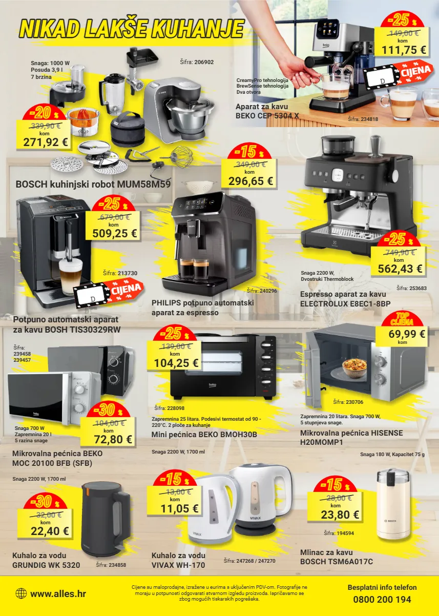cijene su maloprodajne, izražene u eurima s uključenim pdv-om. fotografije ne moraju u potpunosti odgovarati stvarnom izgledu proizvoda. ispričavamo se zbog mogućih tiskarskih pogrešaka. besplatni info telefon 0800 200 194 www.alles.hr mikrovalna pećnica beko moc 20100 bfb (sfb) šifra: 239458 239457 snaga 700 w zapremnina 20 l 5 razina snage 72,80 € kom 104,00 € -30 % potpuno automatski aparat za kavu bosh tis30329rw šifra: 213730 509,25 € kom 679,00 € -25 % philips potpuno automatski aparat za espresso mini pećnica beko bmoh30b zapremnina 25 litara. podesivi termostat od 90 - 220°c. 2 ploče za kuhanje šifra: 228098 mikrovalna pećnica hisense h20momp1 šifra: 230706 zapremnina 20 litara. snaga 700 w, 5 stupnjeva snage. šifra: 234858 kuhalo za vodu grundig wk 5320 snaga 2200 w, 1700 ml 22,40 € kom 32,00 € -30 % šifra: 194594 mlinac za kavu bosch tsm6a017c snaga 180 w, kapacitet 75 g 23,80 € kom 28,00 € -15 % aparat za kavu beko cep 5304 x šifra: 234818 creamypro tehnologija brewsense tehnologija dva otvora bosch kuhinjski robot mum58m59 snaga: 1000 w posuda 3,9 l 7 brzina 271,92 € kom 339,90 € -20 % nikad lakše kuhanje nikad lakše kuhanje nikad lakše kuhanje šifra: 206902 111,75 € kom 149,00 € -25 % espresso aparat za kavu electrolux e8ec1-8bp šifra: 253683 296,65 € kom 349,00 € -15 % šifra: 240296 snaga 2200 w, dvostruki thermoblock 562,43 € kom 749,90 € -25 % kuhalo za vodu vivax wh-170 šifra: 247268 / 247270 snaga 2200 w, 1700 ml 11,05 € kom 13,00 € -15 % 104,25 € kom 139,00 € -25 % 69,99 € kom top cijena black friday cijena % % % % % -% % % % % % % % % % black friday cijena % % % % % -% % % % % % % % % %