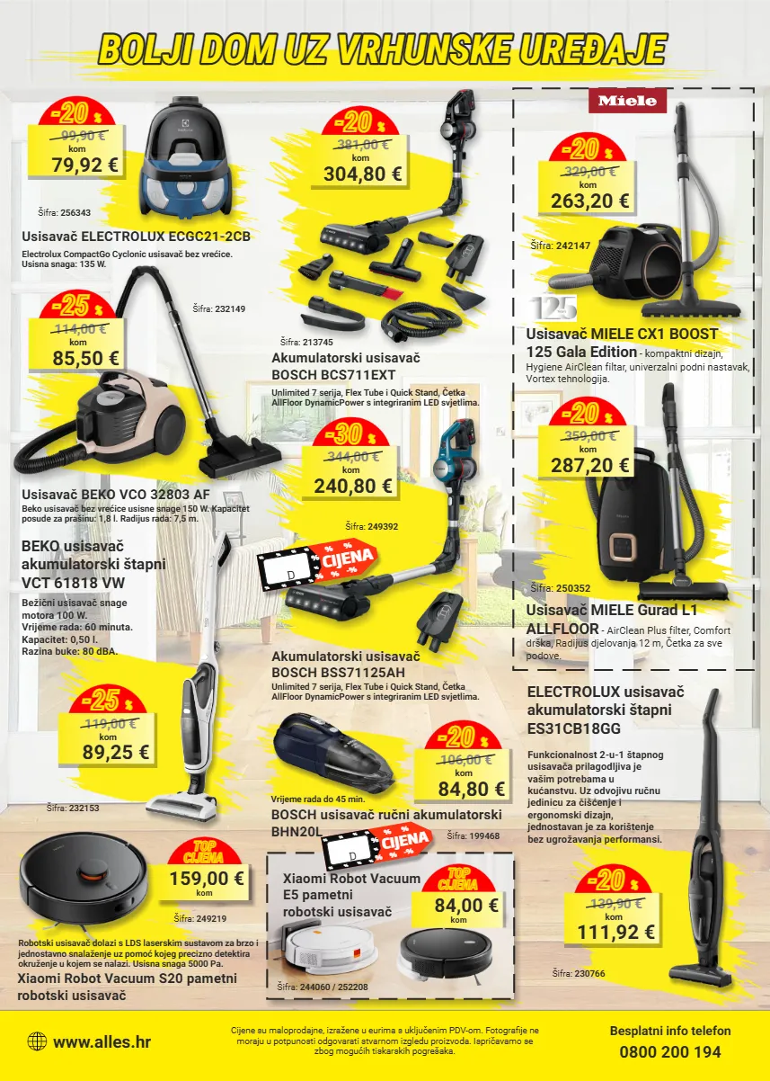 cijene su maloprodajne, izražene u eurima s uključenim pdv-om. fotografije ne moraju u potpunosti odgovarati stvarnom izgledu proizvoda. ispričavamo se zbog mogućih tiskarskih pogrešaka. besplatni info telefon 0800 200 194 www.alles.hr xiaomi robot vacuum e5 pametni robotski usisavač 84,00 € kom top cijena 159,00 € kom top cijena xiaomi robot vacuum s20 pametni robotski usisavač šifra: 244060 / 252208 šifra: 249219 robotski usisavač dolazi s lds laserskim sustavom za brzo i jednostavno snalaženje uz pomoć kojeg precizno detektira okruženje u kojem se nalazi. usisna snaga 5000 pa. bolji dom uz vrhunske uređaje bolji dom uz vrhunske uređaje bolji dom uz vrhunske uređaje electrolux usisavač akumulatorski štapni es31cb18gg šifra: 230766 funkcionalnost 2-u-1 štapnog usisavača prilagodljiva je vašim potrebama u kućanstvu. uz odvojivu ručnu jedinicu za čišćenje i ergonomski dizajn, jednostavan je za korištenje bez ugrožavanja performansi. 111,92 € kom 139,90 € -20 % bosch usisavač ručni akumulatorski bhn20l šifra: 199468 84,80 € kom 106,00 € -20 % vrijeme rada do 45 min. akumulatorski usisavač bosch bcs711ext unlimited 7 serija, flex tube i quick stand, četka allfloor dynamicpower s integriranim led svjetlima. šifra: 213745 304,80 € kom 381,00 € -20 % usisavač miele cx1 boost 125 gala edition - kompaktni dizajn, hygiene airclean filtar, univerzalni podni nastavak, vortex tehnologija. šifra: 242147 263,20 € kom 329,00 € -20 % usisavač miele gurad l1 allfloor - airclean plus filter, comfort drška, radijus djelovanja 12 m, četka za sve podove. šifra: 250352 287,20 € kom 359,00 € -20 % beko usisavač akumulatorski štapni vct 61818 vw šifra: 232153 bežični usisavač snage motora 100 w. vrijeme rada: 60 minuta. kapacitet: 0,50 l. razina buke: 80 dba. 89,25 € kom 119,00 € -25 % akumulatorski usisavač bosch bss71125ah unlimited 7 serija, flex tube i quick stand, četka allfloor dynamicpower s integriranim led svjetlima. šifra: 232149 usisavač electrolux ecgc21-2cb electrolux compactgo cyclonic usisavač bez vrećice. usisna snaga: 135 w. šifra: 256343 79,92 € kom 99,90 € -20 % 85,50 € kom 114,00 € -25 % šifra: 249392 240,80 € kom 344,00 € -30 % usisavač beko vco 32803 af beko usisavač bez vrećice usisne snage 150 w. kapacitet posude za prašinu: 1,8 l. radijus rada: 7,5 m. black friday cijena % % % % % -% % % % % % % % % % black friday cijena % % % % % -% % % % % % % % % %