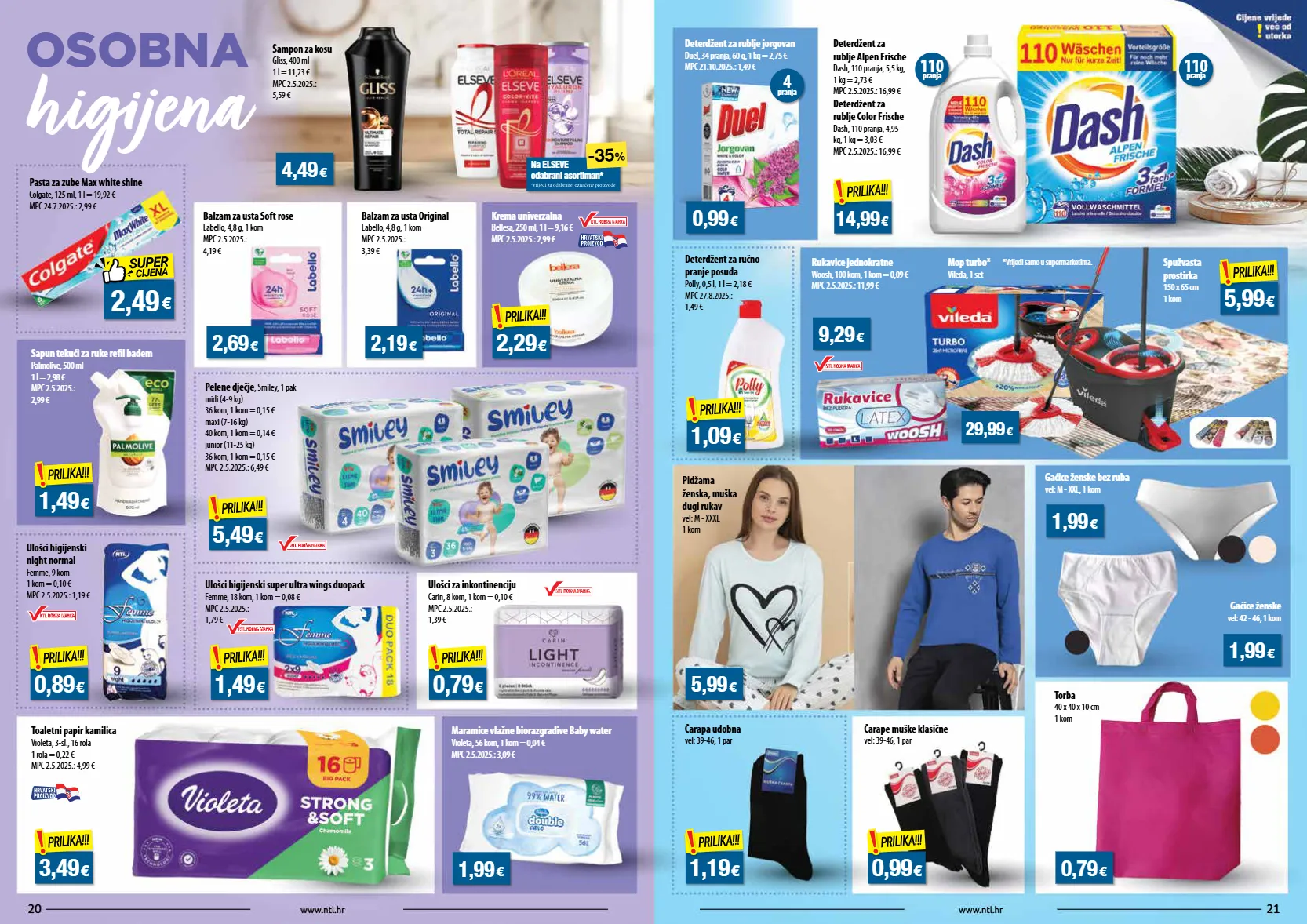 0,99 € 14,99 € 1,09 € 1,99 € 2,69 € 2,19 € 0,79 € 1,49 € 0,89 € 5,49 € 2,29 € 1,49 € 4,49 € 2,49 € 29,99 € 9,29 € deterdžent za rublje alpen frische dash, 110 pranja, 5,5 kg, 1 kg = 2,73 € mpc 2.5.2025.: 16,99 € deterdžent za rublje color frische dash, 110 pranja, 4,95 kg, 1 kg = 3,03 € mpc 2.5.2025.: 16,99 € toaletni papir kamilica violeta, 3-sl., 16 rola 1 rola = 0,22 € mpc 2.5.2025.: 4,99 € maramice vlažne biorazgradive baby water violeta, 56 kom, 1 kom = 0,04 € mpc 2.5.2025.: 3,09 € balzam za usta soft rose labello, 4,8 g, 1 kom mpc 2.5.2025.: 4,19 € balzam za usta original labello, 4,8 g, 1 kom mpc 2.5.2025.: 3,39 € ulošci za inkontinenciju carin, 8 kom, 1 kom = 0,10 € mpc 2.5.2025.: 1,39 € ulošci higijenski super ultra wings duopack femme, 18 kom, 1 kom = 0,08 € mpc 2.5.2025.: 1,79 € ulošci higijenski night normal femme, 9 kom 1 kom = 0,10 € mpc 2.5.2025.: 1,19 € pelene dječje , smiley, 1 pak midi (4-9 kg) 36 kom, 1 kom = 0,15 € maxi (7-16 kg) 40 kom, 1 kom = 0,14 € junior (11-25 kg) 36 kom, 1 kom = 0,15 € mpc 2.5.2025.: 6,49 € krema univerzalna bellesa, 250 ml, 1 l = 9,16 € mpc 2.5.2025.: 2,99 € sapun tekući za ruke refil badem palmolive, 500 ml 1 l = 2,98 € mpc 2.5.2025.: 2,99 € šampon za kosu gliss, 400 ml 1 l = 11,23 € mpc 2.5.2025.: 5,59 € na elseve odabrani asortiman* -35 % mop turbo* vileda, 1 set rukavice jednokratne woosh, 100 kom, 1 kom = 0,09 € mpc 2.5.2025.: 11,99 € *vrijedi samo u supermarketima. 1,99 € 1,99 € 5,99 € 0,79 € 1,19 € 0,99 € gaćice ženske vel: 42 - 46, 1 kom gaćice ženske bez ruba vel: m - xxl, 1 kom pidžama ženska, muška dugi rukav vel: m - xxxl 1 kom torba 40 x 40 x 10 cm 1 kom čarapa udobna vel: 39-46, 1 par čarape muške klasične vel: 39-46, 1 par 5,99 € spužvasta prostirka 150 x 65 cm 1 kom 4 pranja 110 pranja 110 pranja osobna higijena deterdžent za rublje jorgovan duel, 34 pranja, 60 g, 1 kg = 2,75 € mpc 21.10.2025.: 1,49 € deterdžent za ručno pranje posuđa polly, 0,5 l, 1 l = 2,18 € mpc 27.8.2025.: 1,49 € 3,49 € pasta za zube max white shine colgate, 125 ml, 1 l = 19,92 € mpc 24.7.2025.: 2,99 € 20 www.ntl.hr 21 www.ntl.hr