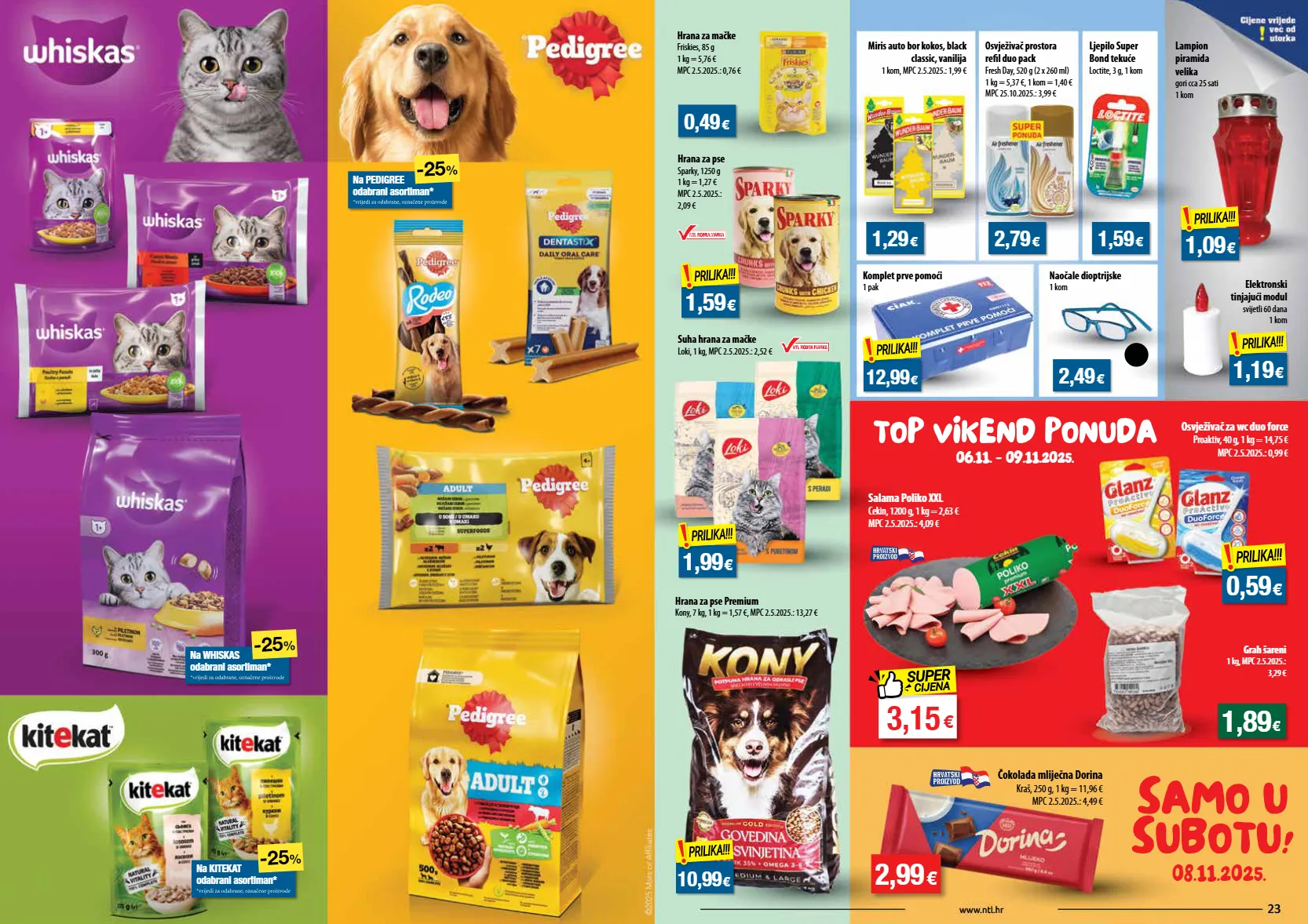 čokolada mliječna dorina kraš, 250 g, 1 kg = 11,96 € mpc 2.5.2025.: 4,49 € 2,99 € 3,15 € 0,59 € salama poliko xxl cekin, 1200 g, 1 kg = 2,63 € mpc 2.5.2025.: 4,09 € osvježivač za wc duo force proaktiv, 40 g, 1 kg = 14,75 € mpc 2.5.2025.: 0,99 € 0,49 € 1,59 € 1,99 € 10,99 € hrana za mačke friskies, 85 g 1 kg = 5,76 € mpc 2.5.2025.: 0,76 € hrana za pse sparky, 1250 g 1 kg = 1,27 € mpc 2.5.2025.: 2,09 € suha hrana za mačke loki, 1 kg, mpc 2.5.2025.: 2,52 € hrana za pse premium kony, 7 kg, 1 kg = 1,57 €, mpc 2.5.2025.: 13,27 € 1,19 € 1,09 € 12,99 € 2,49 € 1,59 € elektronski tinjajući modul svijetli 60 dana 1 kom lampion piramida velika gori cca 25 sati 1 kom naočale dioptrijske 1 kom ljepilo super bond tekuće loctite, 3 g, 1 kom 1,29 € miris auto bor kokos, black classic, vanilija 1 kom, mpc 2.5.2025.: 1,99 € 2,79 € osvježivač prostora refil duo pack fresh day, 520 g (2 x 260 ml) 1 kg = 5,37 €, 1 kom = 1,40 € mpc 25.10.2025.: 3,99 € na whiskas odabrani asortiman* -25 % na pedigree odabrani asortiman* -25 % na kitekat odabrani asortiman* -25 % 06.11. - 09.11.2025. 08.11.2025. komplet prve pomoći 1 pak grah šareni 1 kg, mpc 2.5.2025.: 3,29 € 1,89 € 23 www.ntl.hr