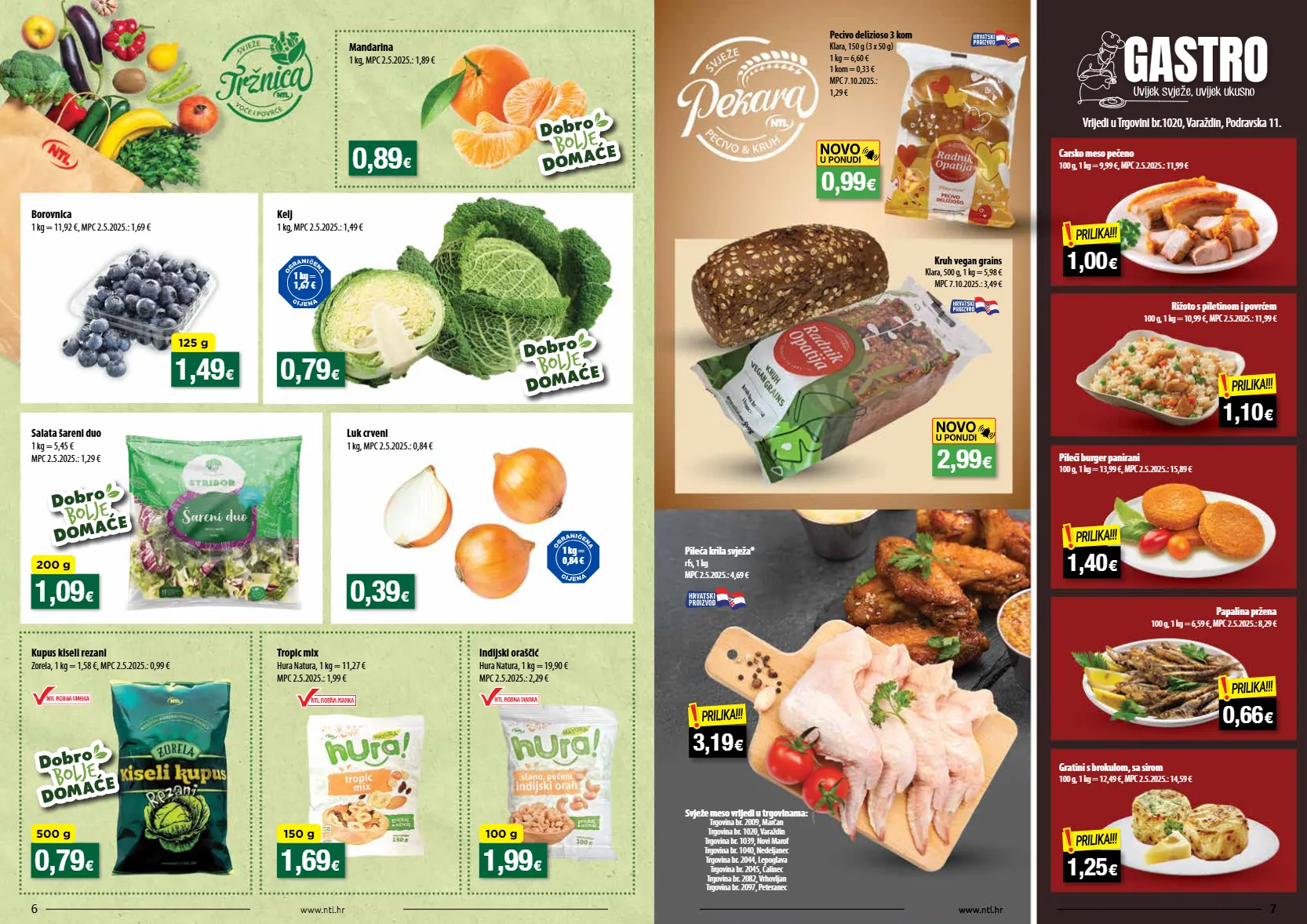 vrijedi u trgovini br.1020, varaždin, podravska 11. gastro kruh vegan grains klara, 500 g, 1 kg = 5,98 € mpc 7.10.2025.: 3,49 € 2,99 € 0,99 € 1,10 € 1,00 € 1,40 € 1,25 € 0,66 € carsko meso pečeno 100 g, 1 kg = 9,99 €, mpc 2.5.2025.: 11,99 € rižoto s piletinom i povrćem 100 g, 1 kg = 10,99 €, mpc 2.5.2025.: 11,99 € pileći burger panirani 100 g, 1 kg = 13,99 €, mpc 2.5.2025.: 15,89 € papalina pržena 100 g, 1 kg = 6,59 €, mpc 2.5.2025.: 8,29 € gratini s brokulom, sa sirom 100 g, 1 kg = 12,49 €, mpc 2.5.2025.: 14,59 € pileća krila svježa* rfs, 1 kg mpc 2.5.2025.: 4,69 € 3,19 € svježe meso vrijedi u trgovinama: trgovina br. 2009, marčan trgovina br. 1020, varaždin trgovina br. 1039, novi marof trgovina br. 1040, nedeljanec trgovina br. 2044, lepoglava trgovina br. 2045, čalinec trgovina br. 2082, vrhovljan trgovina br. 2097, peteranec pecivo delizioso 3 kom klara, 150 g (3 x 50 g) 1 kg = 6,60 € 1 kom = 0,33 € mpc 7.10.2025.: 1,29 € luk crveni 1 kg, mpc 2.5.2025.: 0,84 € mandarina 1 kg, mpc 2.5.2025.: 1,89 € kelj 1 kg, mpc 2.5.2025.: 1,49 € borovnica 1 kg = 11,92 €, mpc 2.5.2025.: 1,69 € salata šareni duo 1 kg = 5,45 € mpc 2.5.2025.: 1,29 € kupus kiseli rezani zorela, 1 kg = 1,58 €, mpc 2.5.2025.: 0,99 € tropic mix hura natura, 1 kg = 11,27 € mpc 2.5.2025.: 1,99 € indijski oraščić hura natura, 1 kg = 19,90 € mpc 2.5.2025.: 2,29 € 0,39 € 0,89 € 0,79 € 1,09 € 200 g 1,49 € 125 g 0,79 € 500 g 1,69 € 150 g 1,99 € 100 g 1 kg = 0,84 € 1 kg = 1,67 € 7 www.ntl.hr 6 www.ntl.hr