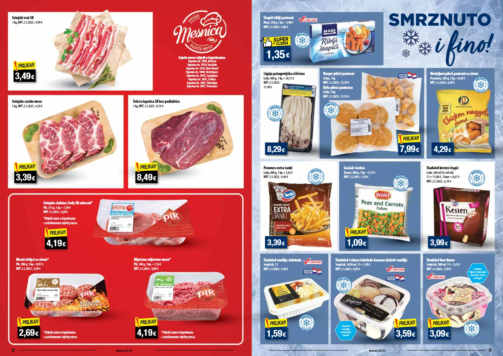 svježe meso vrijedi u trgovinama: trgovina br. 2009, marčan trgovina br. 1020, varaždin trgovina br. 1039, novi marof trgovina br. 1040, nedeljanec trgovina br. 2044, lepoglava trgovina br. 2045, čalinec trgovina br. 2082, vrhovljan trgovina br. 2097, peteranec 1,09 € 3,59 € 3,09 € 1,59 € 3,99 € 3,39 € 8,29 € 7,99 € 4,29 € grašak i mrkva vernet, 400 g, 1 kg = 2,73 € mpc 2.5.2025.: 1,39 € štapići riblji panirani mare, 250 g, 1 kg = 5,40 € mpc 2.5.2025.: 1,86 € sladoled 4 okusa čokolada-banana-biskvit-vanilija smiješak, 1650 ml, 1 l = 2,18 € mpc 2.5.2025.: 4,99 € sladoled four flavor smiješak, 900 ml, 1 l = 3,43 € mpc 2.5.2025.: 3,99 € sladoled vanilija-čokolada smiješak, 1 l mpc 2.5.2025.: 1,99 € 1,35 € sladoled kesten štapić ledo, 360 ml (6 x 60 ml) 1 l = 11,08 €, 1 kom = 0,67 € mpc 2.5.2025.: 6,19 € lignja patagonijska očišćena ledo, 400 g, 1 kg = 20,73 € mpc 2.5.2025.: 11,49 € burger pileći panirani cekin, 1 kg mpc 2.5.2025.: 13,29 € krila pileća panirana cekin, 1 kg mpc 2.5.2025.: 11,79 € medaljoni pileći panirani sa sirom perutnina, 500 g, 1 kg = 8,58 € mpc 2.5.2025.: 6,49 € s m r z n u t o s m r z n u t o s m r z n u t o s m r z n u t o s m r z n u t o s m r z n u t o s m r z n u t o s m r z n u t o s m r z n u t o s m r z n u t o s m r z n u t o s m r z n u t o s m r z n u t o s m r z n u t o s m r z n u t o s m r z n u t o s m r z n u t o s m r z n u t o s m r z n u t o s m r z n u t o • malina • bijela čokolada • šumsko voće • nougat • banana • vanilija • čokolada • bisvit smrznuto i fino! pommes extra tanki ledo, 600 g, 1 kg = 5,65 € mpc 2.5.2025.: 4,49 € *vrijedi samo u trgovinama s asortimanom svježeg mesa. *vrijedi samo u trgovinama s asortimanom svježeg mesa. 2,69 € 4,19 € mesni uštipci sa sirom* pik, 300 g, 1 kg = 8,97 € mpc 2.5.2025.: 2,99 € miješano mljeveno meso* pik, 540 g, 1 kg = 7,76 € mpc 2.5.2025.: 4,89 € *vrijedi samo u trgovinama s asortimanom svježeg mesa. 4,19 € svinjska slabina i leđa sk odrezak* pik, 575 g, 1 kg = 7,29 € mpc 2.5.2025.: 4,69 € 3,39 € 3,49 € 8,49 € svinjsko carsko meso 1 kg, mpc 2.5.2025.: 4,29 € svinjski vrat sk 1 kg, mpc 2.5.2025.: 4,99 € teleća lopatica sk bez podlaktice 1 kg, mpc 2.5.2025.: 8,79 € 9 www.ntl.hr 8 www.ntl.hr