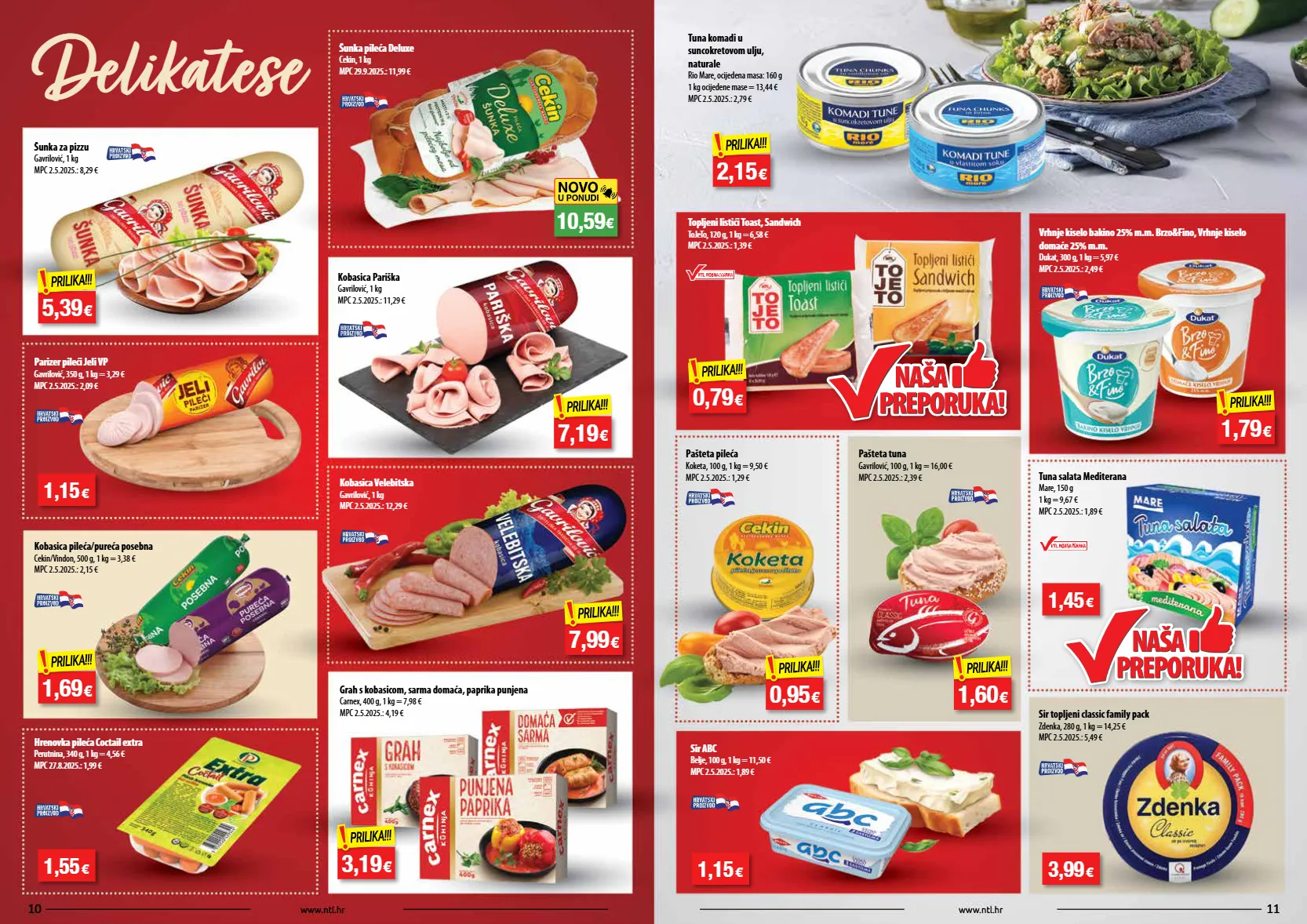 delikatese 1,69 € 0,95 € 2,15 € 3,19 € 1,55 € 5,39 € 7,19 € 1,15 € 7,99 € 1,60 € 1,45 € 1,79 € 1,15 € 3,99 € 0,79 € kobasica pileća/pureća posebna cekin/vindon, 500 g, 1 kg = 3,38 € mpc 2.5.2025.: 2,15 € šunka pileća deluxe cekin, 1 kg mpc 29.9.2025.: 11,99 € tuna komadi u suncokretovom ulju, naturale rio mare, ocijeđena masa: 160 g 1 kg ocijeđene mase = 13,44 € mpc 2.5.2025.: 2,79 € 10,59 € grah s kobasicom, sarma domaća, paprika punjena carnex, 400 g, 1 kg = 7,98 € mpc 2.5.2025.: 4,19 € hrenovka pileća coctail extra perutnina, 340 g, 1 kg = 4,56 € mpc 27.8.2025.: 1,99 € šunka za pizzu gavrilović, 1 kg mpc 2.5.2025.: 8,29 € kobasica pariška gavrilović, 1 kg mpc 2.5.2025.: 11,29 € parizer pileći jeli vp gavrilović, 350 g, 1 kg = 3,29 € mpc 2.5.2025.: 2,09 € kobasica velebitska gavrilović, 1 kg mpc 2.5.2025.: 12,29 € pašteta tuna gavrilović, 100 g, 1 kg = 16,00 € mpc 2.5.2025.: 2,39 € tuna salata mediterana mare, 150 g 1 kg = 9,67 € mpc 2.5.2025.: 1,89 € vrhnje kiselo bakino 25% m.m. brzo&fino, vrhnje kiselo domaće 25% m.m. dukat, 300 g, 1 kg = 5,97 € mpc 2.5.2025.: 2,49 € sir abc belje, 100 g, 1 kg = 11,50 € mpc 2.5.2025.: 1,89 € sir topljeni classic family pack zdenka, 280 g, 1 kg = 14,25 € mpc 2.5.2025.: 5,49 € topljeni listići toast, sandwich tojeto, 120 g, 1 kg = 6,58 € mpc 2.5.2025.: 1,39 € pašteta pileća koketa, 100 g, 1 kg = 9,50 € mpc 2.5.2025.: 1,29 € 10 www.ntl.hr 11 www.ntl.hr