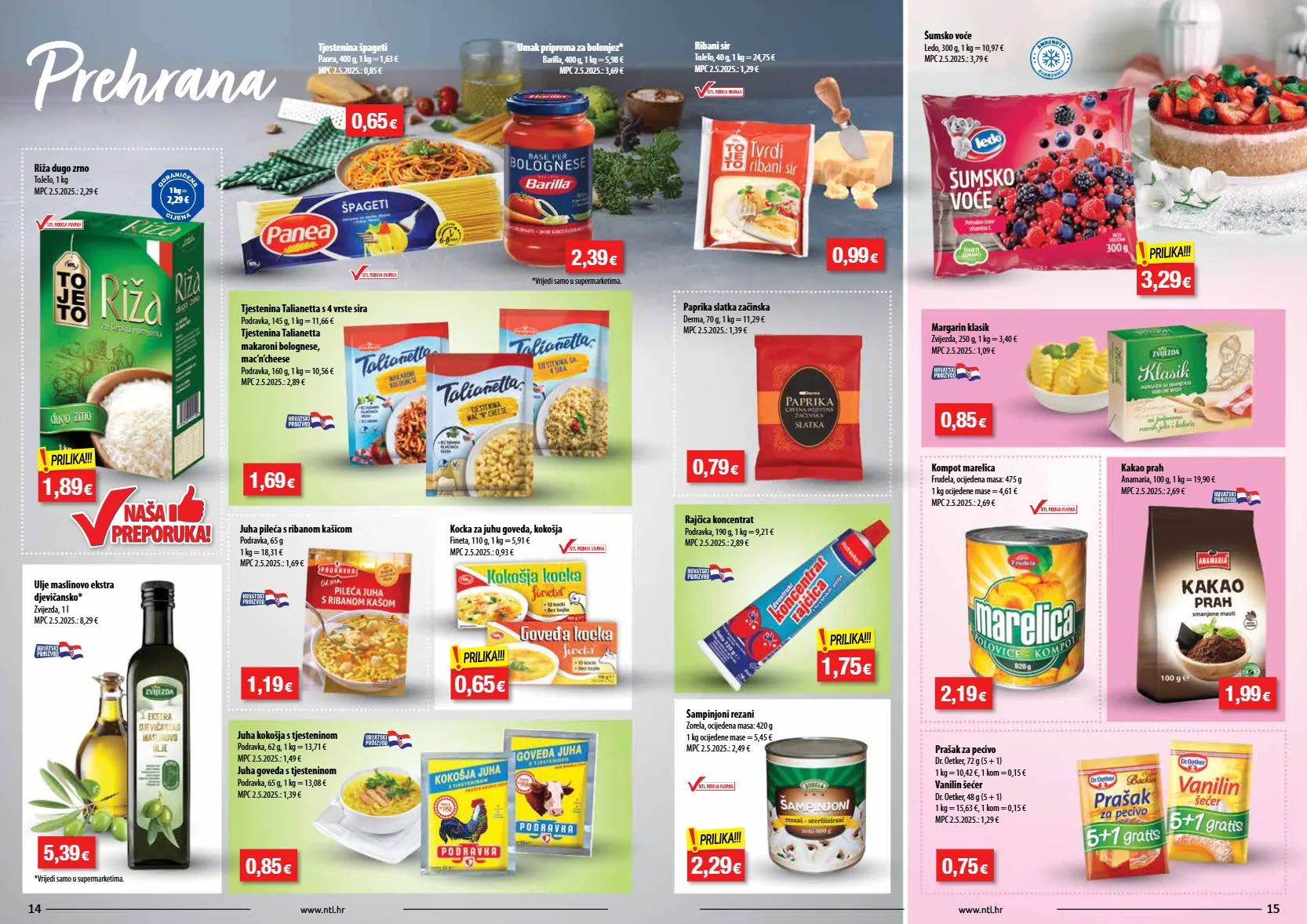 0,65 € 1,99 € 0,65 € 0,75 € 1,19 € 1,69 € 0,85 € 0,85 € 0,99 € 5,39 € 1,75 € 2,39 € 2,19 € 2,29 € 1,89 € kocka za juhu goveđa, kokošja fineta, 110 g, 1 kg = 5,91 € mpc 2.5.2025.: 0,93 € kakao prah anamaria, 100 g, 1 kg = 19,90 € mpc 2.5.2025.: 2,69 € tjestenina špageti panea, 400 g, 1 kg = 1,63 € mpc 2.5.2025.: 0,85 € prašak za pecivo dr. oetker, 72 g (5 + 1) 1 kg = 10,42 €, 1 kom = 0,15 € vanilin šećer dr. oetker, 48 g (5 + 1) 1 kg = 15,63 €, 1 kom = 0,15 € mpc 2.5.2025.: 1,29 € tjestenina talianetta s 4 vrste sira podravka, 145 g, 1 kg = 11,66 € tjestenina talianetta makaroni bolognese, mac’n’cheese podravka, 160 g, 1 kg = 10,56 € mpc 2.5.2025.: 2,89 € juha pileća s ribanom kašicom podravka, 65 g 1 kg = 18,31 € mpc 2.5.2025.: 1,69 € juha kokošja s tjesteninom podravka, 62 g, 1 kg = 13,71 € mpc 2.5.2025.: 1,49 € juha goveđa s tjesteninom podravka, 65 g, 1 kg = 13,08 € mpc 2.5.2025.: 1,39 € margarin klasik zvijezda, 250 g, 1 kg = 3,40 € mpc 2.5.2025.: 1,09 € ribani sir tojeto, 40 g, 1 kg = 24,75 € mpc 2.5.2025.: 1,29 € 0,79 € paprika slatka začinska derma, 70 g, 1 kg = 11,29 € mpc 2.5.2025.: 1,39 € ulje maslinovo ekstra djevičansko* zvijezda, 1 l mpc 2.5.2025.: 8,29 € *vrijedi samo u supermarketima. rajčica koncentrat podravka, 190 g, 1 kg = 9,21 € mpc 2.5.2025.: 2,89 € *vrijedi samo u supermarketima. umak priprema za bolonjez* barilla, 400 g, 1 kg = 5,98 € mpc 2.5.2025.: 3,69 € kompot marelica frudela, ocijeđena masa: 475 g 1 kg ocijeđene mase = 4,61 € mpc 2.5.2025.: 2,69 € šampinjoni rezani zorela, ocijeđena masa: 420 g 1 kg ocijeđene mase = 5,45 € mpc 2.5.2025.: 2,49 € riža dugo zrno tojeto, 1 kg mpc 2.5.2025.: 2,29 € 3,29 € šumsko voće ledo, 300 g, 1 kg = 10,97 € mpc 2.5.2025.: 3,79 € 1 kg = 2,29 € s m r z n u t o s m r z n u t o prehrana 14 www.ntl.hr 15 www.ntl.hr
