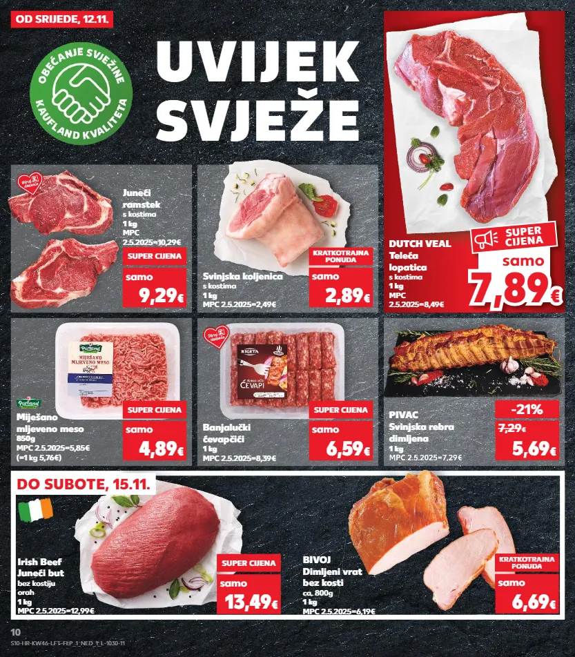 kratkotrajna ponuda samo samo kratkotrajna ponuda samo kratkotrajna ponuda samo samo kratkotrajna ponuda samo kratkotrajna ponuda samo svježe uvijek pivac svinjska rebra dimljena 1 kg mpc 2.5.2025=7,29€ banjalučki ćevapčići 1 kg mpc 2.5.2025=8,39€ miješano mljeveno meso 850g mpc 2.5.2025=5,85€ (=1 kg 5,76€) č i s t a k v a l i t e t a -21% 5,69 € 7,29 € mpc 2.5.2025=7,29€ 5,69 bivoj dimljeni vrat bez kosti ca. 800g 1 kg mpc 2.5.2025=6,19€ kratkotrajna ponuda kratkotrajna ponuda super cijena kratkotrajna super cijena kratkotrajna ponuda super cijena onuda 6,69 € samo super cijena 6,59 € samo super cijena 4,89 € samo svinjska koljenica s kostima 1 kg mpc 2.5.2025=2,49€ kratkotrajna ponuda 2,89 € samo dutch veal teleća lopatica s kostima 1 kg mpc 2.5.2025=8,49€ super cijena 13,49 € samo irish beef juneći but bez kostiju orah 1 kg mpc 2.5.2025=12,99€ super cijena 9,29 € samo juneći ramstek s kostima 1 kg mpc 2.5.2025=10,29€ 7,8 9 7,89 € € samo super cijena od srijede, 12.11. do subote, 15.11. s10-hr-kw46-lft-flp_1_ned_1_l-1030-11 10