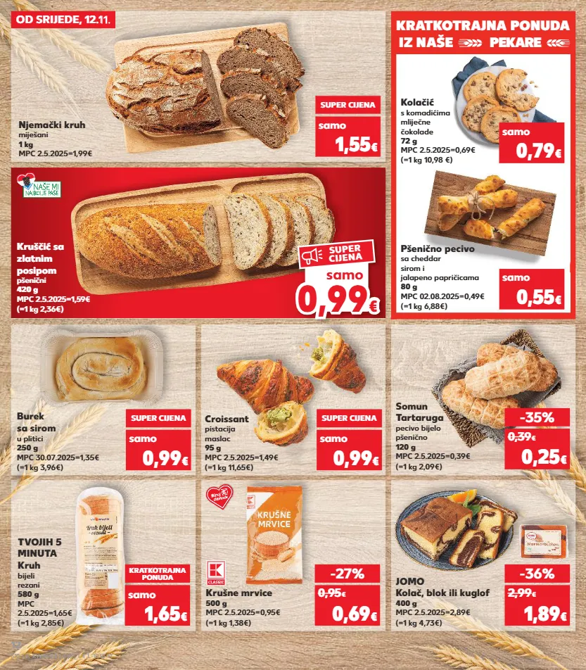 kratkotrajna ponuda kratkotrajna ponuda kratkotrajna ponuda kratkotrajna ponuda kratkotrajna ponuda kratkotrajna ponuda kratkotrajna ponuda iz naše pekare od srijede, 12.11. somun tartaruga pecivo bijelo pšenično 120 g mpc 2.5.2025=0,39€ (=1 kg 2,09€) kruščić sa zlatnim posipom pšenični 420 g mpc 2.5.2025=1,59€ (=1 kg 2,36€) pšenično pecivo sa cheddar sirom i jalapeno papričicama 80 g mpc 02.08.2025=0,49€ (=1 kg 6,88€) burek sa sirom u plitici 250 g mpc 30.07.2025=1,35€ (=1 kg 3,96€) croissant pistacija maslac 95 g mpc 2.5.2025=1,49€ (=1 kg 11,65€) -35% 0,25 € 0,39 € samo 0,55 € super cijena samo 0,99 € samo super cijena 0,99 € krušne mrvice 500 g mpc 2.5.2025=0,95€ (=1 kg 1,38€) -27% 0,69 € 0,95 € jomo kolač, blok ili kuglof 400 g mpc 2.5.2025=2,89€ (=1 kg 4,73€) -36% 1,89 € 2,99 € samo 0,79 € (=1 kg 10,98 €) kolačić s komadićima mliječne čokolade 72 g mpc 2.5.2025=0,69€ njemački kruh miješani 1 kg mpc 2.5.2025=1,99€ kratkotrajna ponuda samo 1,65 € (=1 kg 2,85€) tvojih 5 minuta kruh bijeli rezani 580 g mpc 2.5.2025=1,65€ samo super cijena 1,55 € od srijede, 12.11. 0,99 0,99 € € samo super cijena s12-hr-kw46-lft-frp_1_1_l-1030-11 12
