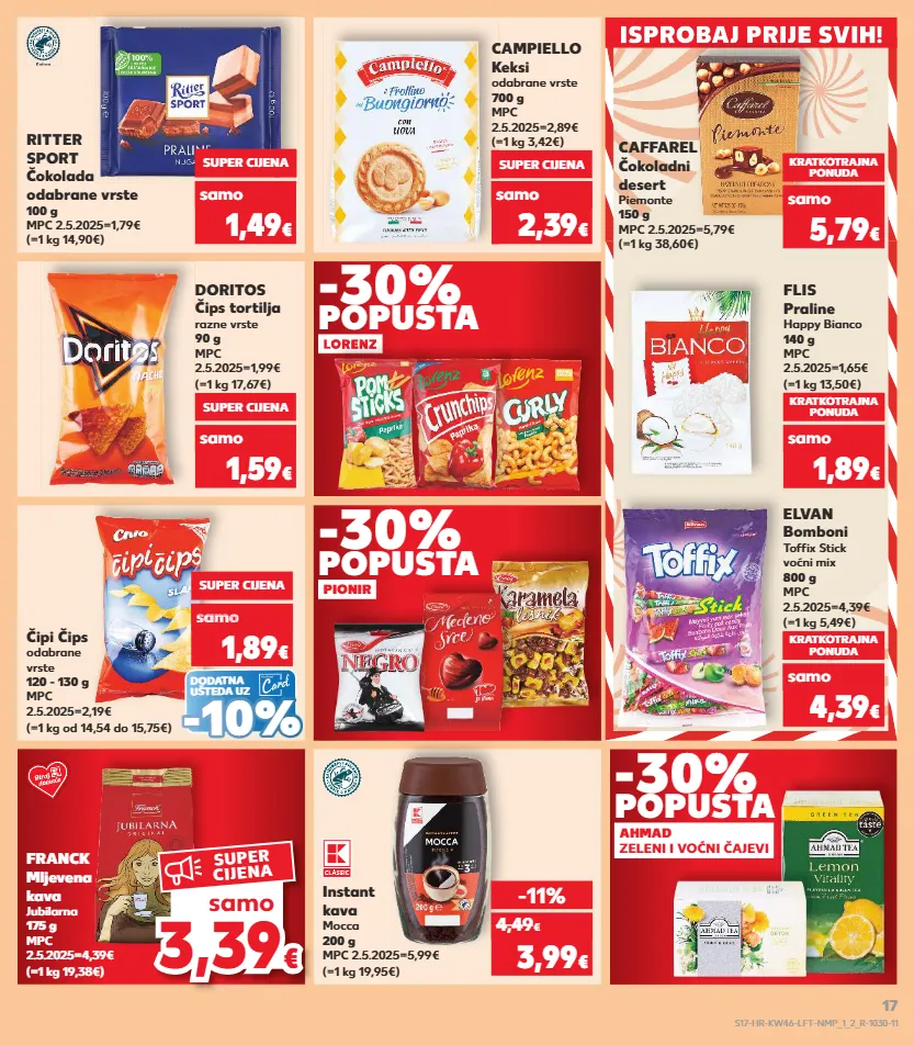 kratkotrajna ponuda samo samo kratkotrajna ponuda samo samo kratkotrajna ponuda samo kratkotrajna ponuda samo samo kratkotrajna ponuda isprobaj prije svih! isprobaj prije svih! doritos čips tortilja razne vrste 90 g mpc 2.5.2025=1,99€ (=1 kg 17,67€) super cijena 1,59 € samo flis praline happy bianco 140 g mpc 2.5.2025=1,65€ (=1 kg 13,50€) kratkotrajna ponuda 1,89 € samo franck mljevena kava jubilarna 175 g mpc 2.5.2025=4,39€ (=1 kg 19,38€) instant kava mocca 200 g mpc 2.5.2025=5,99€ (=1 kg 19,95€) elvan bomboni toffix stick voćni mix 800 g mpc 2.5.2025=4,39€ (=1 kg 5,49€) -11% 3,99 € 4,49 € kratkotrajna ponuda 4,39 € samo (=1 kg 3,42€) campiello keksi odabrane vrste 700 g mpc 2.5.2025=2,89€ super cijena 2,39 € samo (=1 kg 14,90€) ritter sport čokolada odabrane vrste 100 g mpc 2.5.2025=1,79€ super cijena 1,49 € samo (=1 kg 38,60€) caffarel čokoladni desert piemonte 150 g mpc 2.5.2025=5,79€ kratkotrajna ponuda 5,79 € samo dodatna ušteda uz (=1 kg od 14,54 do 15,75€) čipi čips odabrane vrste 120 - 130 g mpc 2.5.2025=2,19€ super cijena samo 1,89 € sa o 1,89 sam 1,89 sam 1,8 sam 1,89 sam samo o € o - - 10% 10% 3,3 9 3,39 € € samo super cijena lorenz pionir ahmad zeleni i voćni čajevi -30% -30% -30% popusta popusta popusta lorenz s17-hr-kw46-lft-nmp_1_2_r-1030-11 17