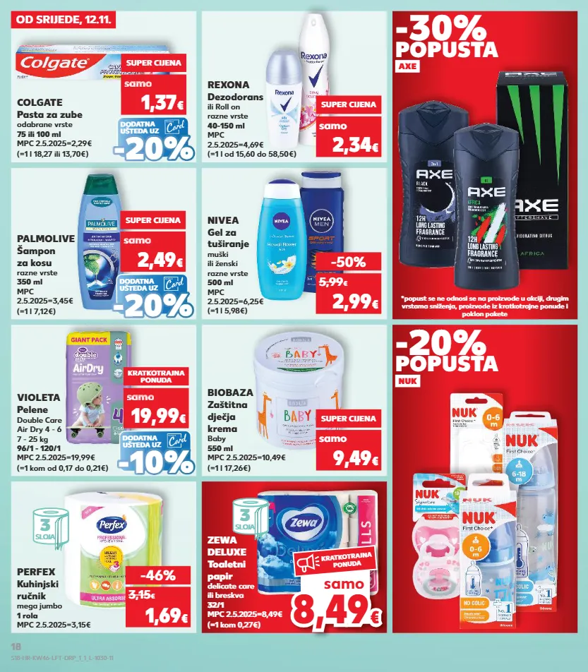 kratkotrajna ponuda samo kratkotrajna ponuda samo kratkotrajna ponuda samo kratkotrajna ponuda samo kratkotrajna ponuda kratkotrajna ponuda ponuda - p tkotrajna ponuda perfex kuhinjski ručnik mega jumbo 1 rola mpc 2.5.2025=3,15€ biobaza zaštitna dječja krema baby 550 ml mpc 2.5.2025=10,49€ (=1 l 17,26€) zewa deluxe toaletni papir delicate care ili breskva 32/1 mpc 2.5.2025=8,49€ (=1 kom 0,27€) super cijena 9,49 € samo -46% 1,69 € 3,15 € -50% 2,99 € 5,99 € (=1 l 5,98€) nivea gel za tuširanje muški ili ženski razne vrste 500 ml mpc 2.5.2025=6,25€ super cijena 2,34 € samo (=1 l od 15,60 do 58,50€) rexona dezodorans ili roll on razne vrste 40-150 ml mpc 2.5.2025=4,69€ dodatna ušteda uz dodatna ušteda uz dodatna ušteda uz (=1 kom od 0,17 do 0,21€) violeta pelene double care air dry 4 - 6 7 - 25 kg 96/1 - 120/1 mpc 2.5.2025=19,99€ (=1 l 18,27 ili 13,70€) colgate pasta za zube odabrane vrste 75 ili 100 ml mpc 2.5.2025=2,29€ (=1 l 7,12€) palmolive šampon za kosu razne vrste 350 ml mpc 2.5.2025=3,45€ super cijena samo 1,37 € sa o 1,35 sam 1,35 sam 1,3 sam 1,35 sam samo o € o kratkotrajna ponuda samo 19,99 € sa 19,99 samo 19,99 samo 19,99 samo 19,99 samo samo € kratkotrajna p - 29% tkotrajna 29% ponuda 29% samo 2,49 € o 3,55 samo 3,55 samo 3,55 samo 3,55 samo samo € o € o - - 20 % 20 % - - 10% 10% - - 20 % 20 % super cijena 8,4 9 8,49 € € samo kratkotrajna ponuda od srijede, 12.11. *popust se ne odnosi se na proizvode u akciji, drugim vrstama sniženja, proizvode iz kratkotrajne ponude i poklon pakete axe nuk -30% -20% popusta popusta 3 sloja 3 sloja s18-hr-kw46-lft-drp_1_1_l-1030-11 18