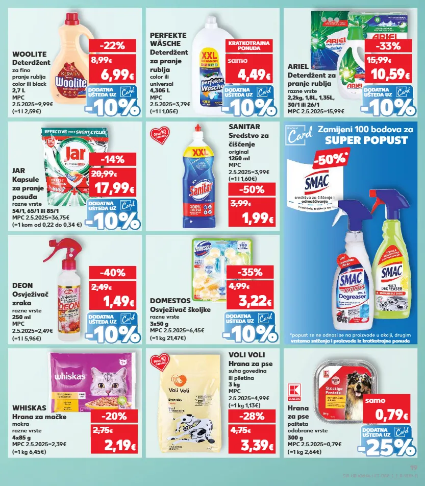 kratkotrajna ponuda samo kratkotrajna ponuda samo kratkotrajna ponuda samo kratkotrajna ponuda samo kratkotrajna ponuda samo kratkotrajna ponuda samo kratkotrajna ponuda kratkotrajna ponuda samo samo whiskas hrana za mačke mokra razne vrste 4x85 g mpc 2.5.2025=2,39€ (=1 kg 6,45€) -20% 2,19 € 2,75 € voli voli hrana za pse suha govedina ili piletina 3 kg mpc 2.5.2025=4,99€ (=1 kg 1,13€) -28% 3,39 € 4,75 € (=1 l 1,60€) sanitar sredstvo za čišćenje original 1250 ml mpc 2.5.2025=3,99€ -50% 1,99 € 3,99 € dodatna ušteda uz (=1 kom 0,36€) ariel deterdžent za pranje rublja razne vrste 2,2kg, 1,8l, 1,35l, 30/1 ili 26/1 mpc 2.5.2025=15,99€ -33% 10,59 € 15,99 € dodatna ušteda uz (=1 kg 21,47€) domestos osvježivač školjke razne vrste 3x50 g mpc 2.5.2025=6,45€ -35% 3,22 € 4,99 € - - 10% 10% dodatna ušteda uz (=1 kom od 0,22 do 0,34 €) jar kapsule za pranje posuđa razne vrste 54/1, 65/1 ili 85/1 mpc 2.5.2025=36,75€ -14% 17,99 € 20,99 € - - 10% 10% - - 10% 10% (=1 kg 2,64€) hrana za pse pašteta odabrane vrste 300 g mpc 2.5.2025=0,79€ samo 0,79 € - - 25 % 25 % dodatna ušteda uz dodatna ušteda uz dodatna ušteda uz dodatna ušteda uz (=1 l 2,59€) woolite deterdžent za fino pranje rublja color ili black 2,7 l mpc 2.5.2025=9,99€ (=1 l 5,96€) deon osvježivač zraka razne vrste 250 ml mpc 2.5.2025=2,49€ (=1 l 1,05€) perfekte wäsche deterdžent za pranje rublja color ili universal 4,305 l mpc 2.5.2025=3,79€ -40% -22% kratkotrajna ponuda 1,49 € 2,49 € 6,99 € 8,99 € samo 4,49 € sa o 4,49 samo 4,49 samo 4,4 samo 4,49 samo samo € o € o - - 10% 10% - - 10% 10% - - 10% 10% zamijeni 100 bodova za super popust -50% * *popust se ne odnosi se na proizvode u akciji, drugim vrstama sniženja i proizvode iz kratkotrajne ponude sredstva za čišćenje i odmašćivanje sredstva za čišćenje i *popust se ne odnosi se na proizvode u akciji, drugim sredstva za čišćenje i sredstva za čišćenje i s19-hr-kw46-lft-drp_1_2_r-1030-11 19