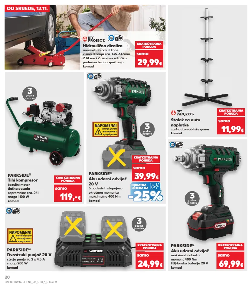 od srijede, 12.11. kratkotrajna ponuda samo 29,99 € hidraulična dizalica nosivost do cca. 2 tone visina dizanja cca. 135-342mm 2 fiksna i 2 okretna kotačića podesiva brzina spuštanja komad 3 parkside ® tihi kompresor bezuljni motor tlačna posuda zapremnine cca. 24 l snaga 1100 w komad 3 kratkotrajna ponuda samo 119,- € parkside ® aku udarni odvijač 20 v 5 podesivih stupnjeva okretnog momenta maksimalno 400 nm komad kratkotrajna ponuda samo 11,99 € 3 parkside ® aku udarni odvijač maksimalni okretni moment 400 nm litij-ionska baterija 20 v komad kratkotrajna ponuda samo 69,99 € stalak za auto naplatke za 4 automobilske gume komad 3 parkside ® dvostruki punjač 20 v struja punjenja 2 x 4,5 a snaga 200 w komad kratkotrajna ponuda samo 24,99 € dodatna ušteda uz - - 25 % 25 % kratkotrajna ponuda samo 39,99 € s20-hr-kw46-lft-nf_sri_uto_1_l-1030-11 20