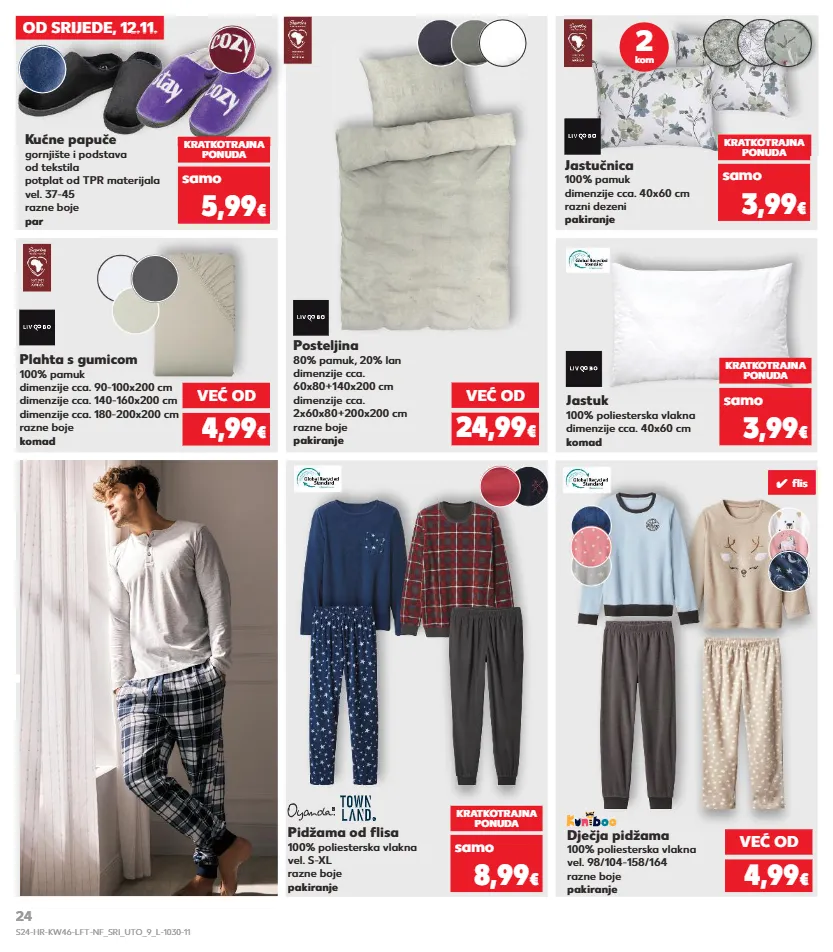 od srijede, 12.11. od srijede, 12.11. kućne papuče gornjište i podstava od tekstila potplat od tpr materijala vel. 37-45 razne boje par posteljina 80% pamuk, 20% lan dimenzije cca. 60x80+140x200 cm dimenzije cca. 2x60x80+200x200 cm razne boje pakiranje kratkotrajna ponuda samo 5,99 € jastučnica 100% pamuk dimenzije cca. 40x60 cm razni dezeni pakiranje jastuk 100% poliesterska vlakna dimenzije cca. 40x60 cm komad kratkotrajna ponuda kratkotrajna ponuda samo samo 3,99 € 3,99 € dječja pidžama 100% poliesterska vlakna vel. 98/104-158/164 razne boje pakiranje pidžama od flisa 100% poliesterska vlakna vel. s-xl razne boje pakiranje kratkotrajna ponuda samo 8,99 € 2 kom već od 24,99 € plahta s gumicom 100% pamuk dimenzije cca. 90-100x200 cm dimenzije cca. 140-160x200 cm dimenzije cca. 180-200x200 cm razne boje komad već od 4,99 € već od 4,99 € ✓ fl is s24-hr-kw46-lft-nf_sri_uto_9_l-1030-11 24